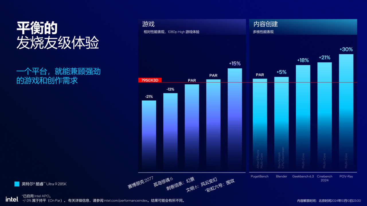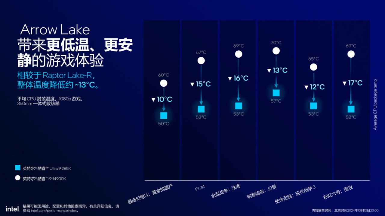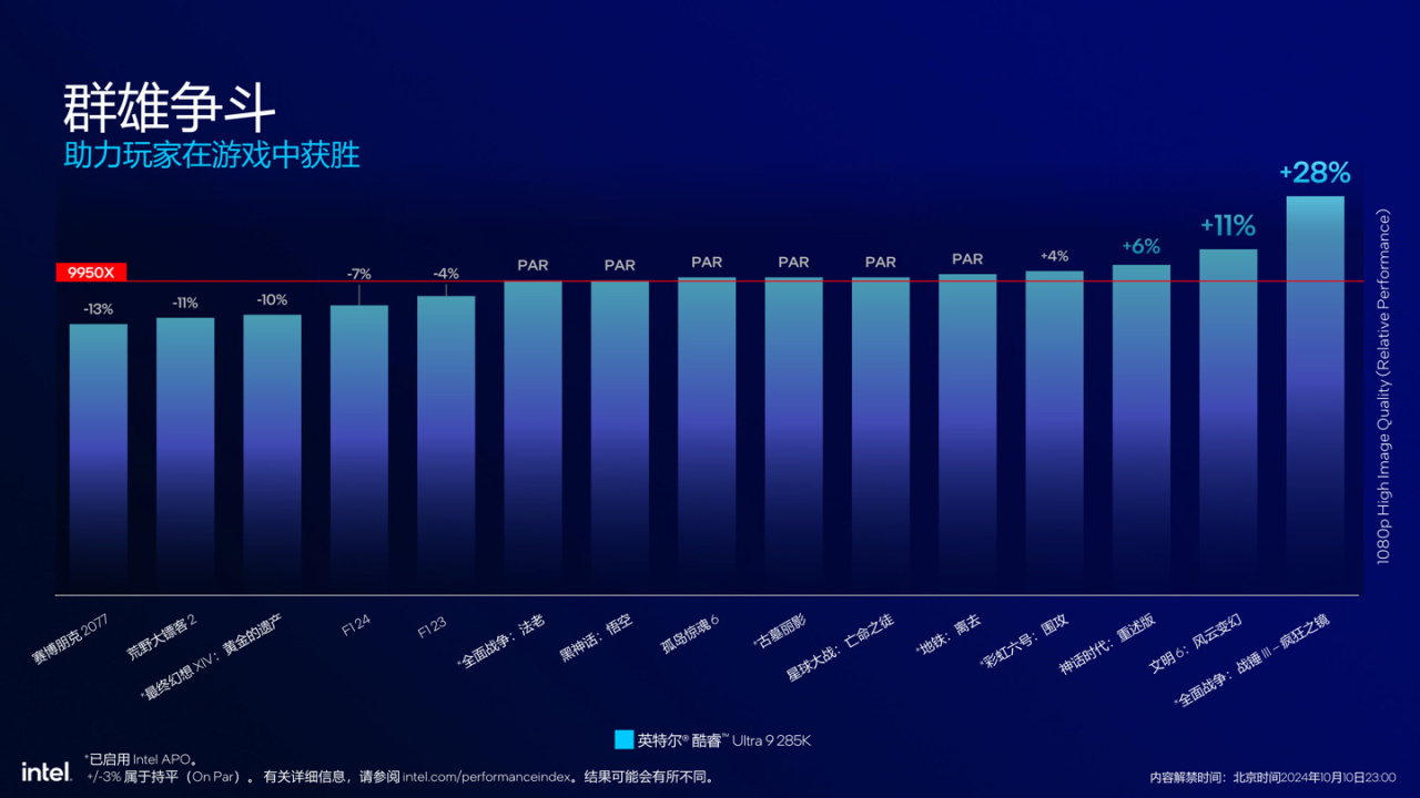 对比9950X,酷睿 Ultra 9 285K 在 15 款游戏中有 6 款 大致持平,有 5 款次于对手,有 4 款优于对手。