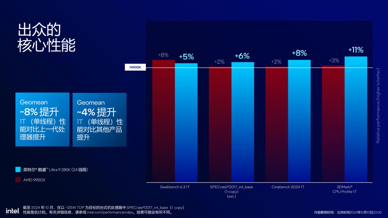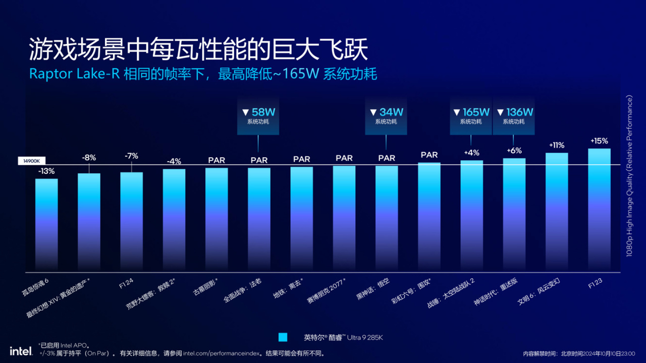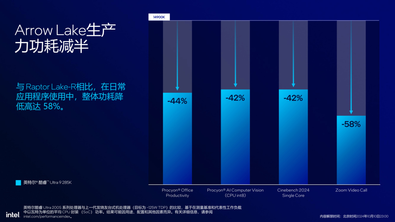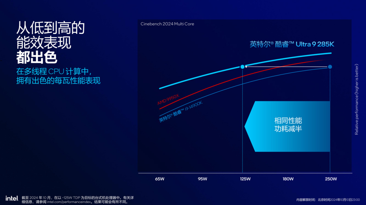 Cinebench 2024 多核测试中,酷睿 Ultra 9 285K 仅需 125W 功耗即可达成 i9-14900K 在 250W 下的表现。