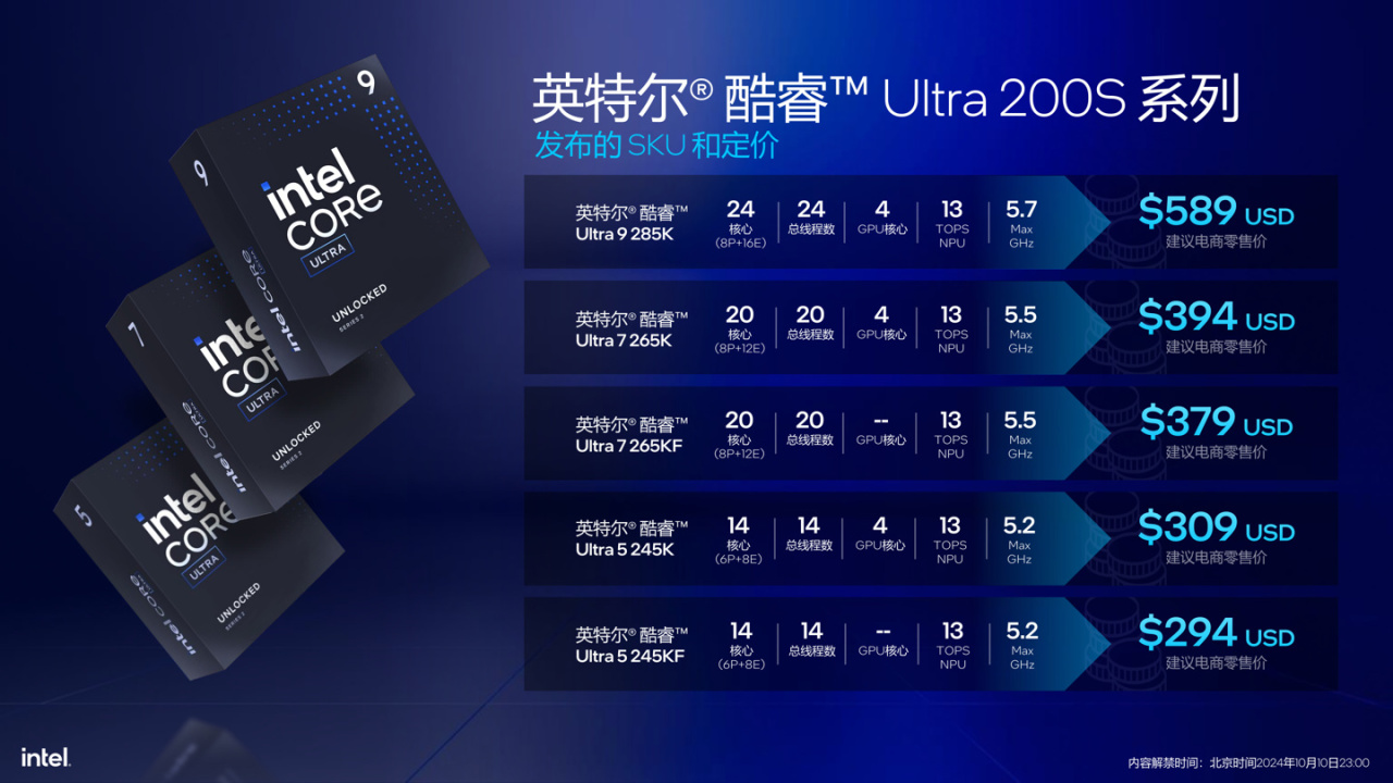 Ultra 9 285K:8P+16E,24 线程,4 Xe 核心,最高睿频 5.7GHz,建议电商零售价 4799元。