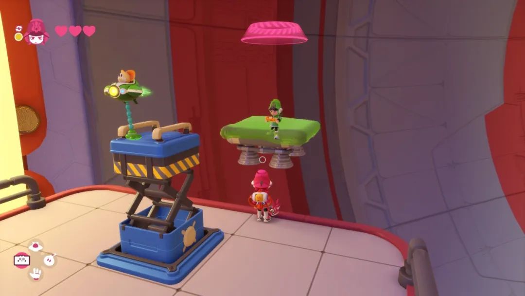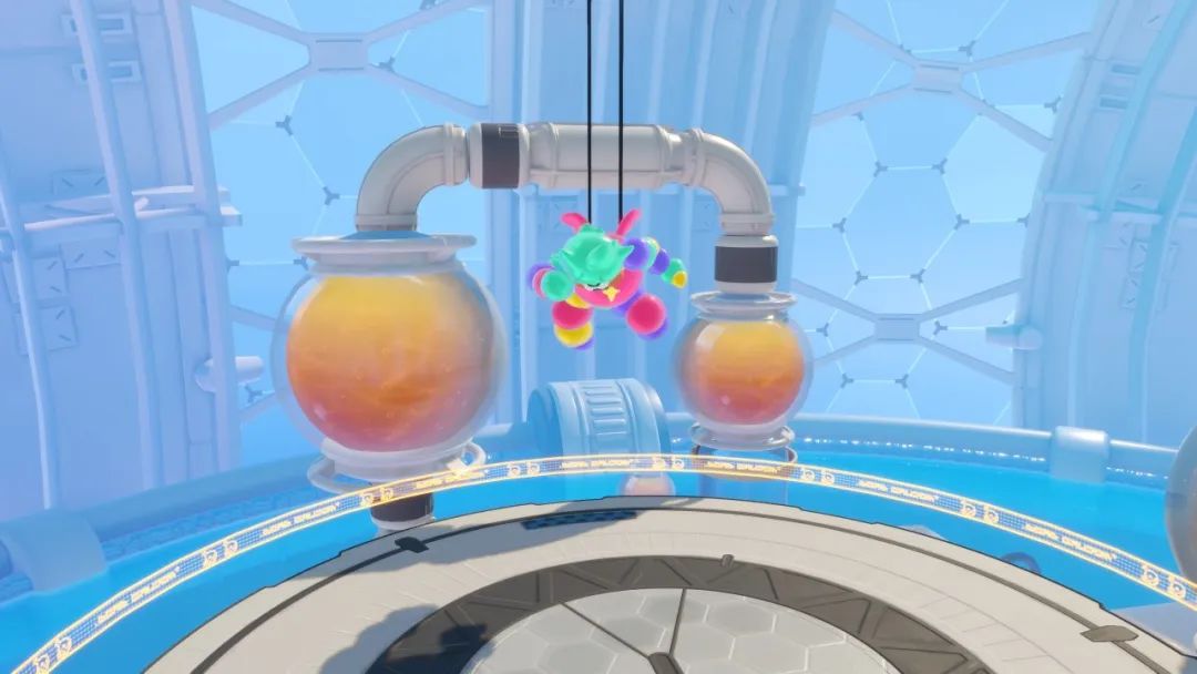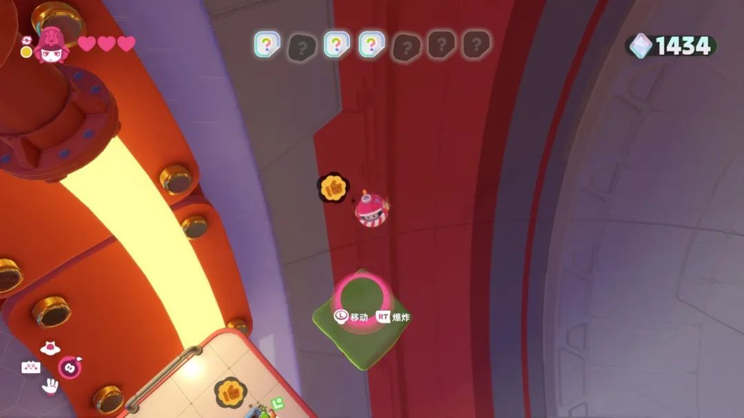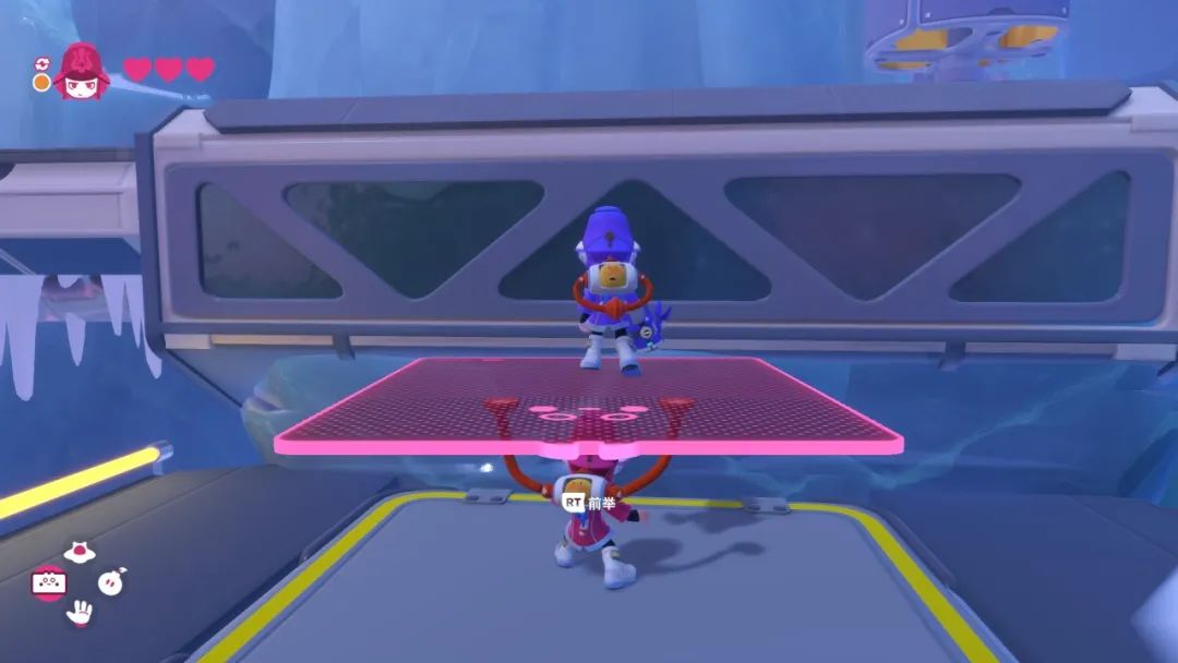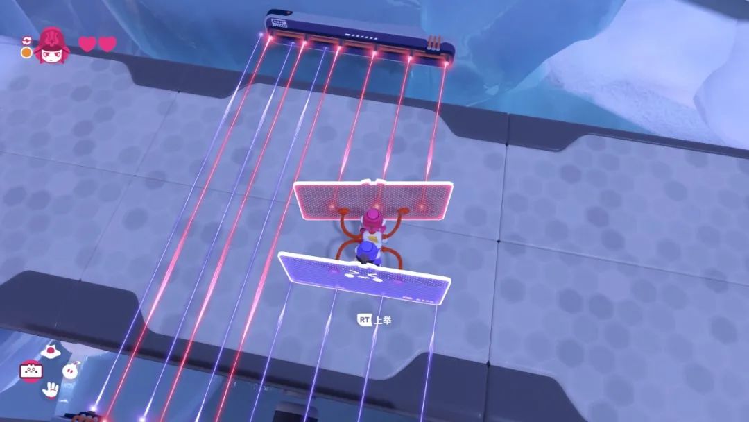 有一處貼紙藏在一個相當偏僻的位置,雖然不知道我們的辦法是不是正常的過關途徑,但是這裏是第一次讓我感受到遊戲有難度的地方。在紙上談兵了一會之後,我跟朋友選擇的方法是他用UFO把機關拉起來,在我跳到他頭頂的瞬間切換到護盾並且上舉,我落地到護盾接着再變成炸彈拿到貼紙。這裏的設計就能明顯看出鷹角對於合作遊戲趣味機制的掌握程度,難度係數五顆星,但合作帶來的快樂也是五顆星。要是我倆坐在一起,估計最後還得擊掌慶祝一下。