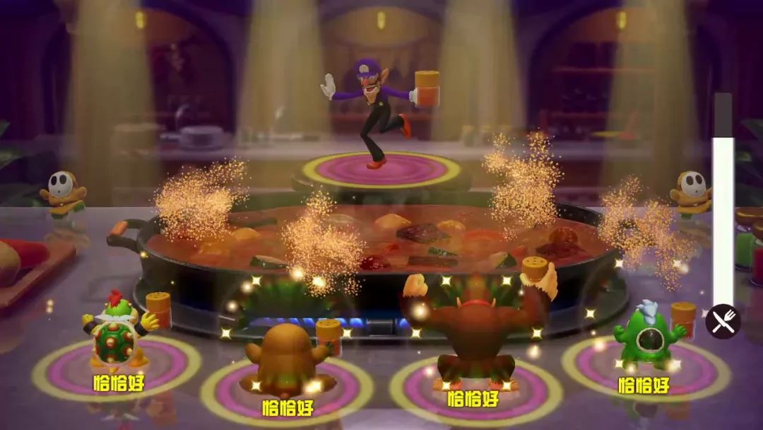 節奏遊戲如今以烹飪廚房形式迴歸,沒有明確的比拼概念,更多是以“共同完成料理”爲目標。例如你要在不斷旋轉的餐桌上,根據節奏堆放漢堡材料;或是模仿瓦路易基的動作,化身撒鹽大師。