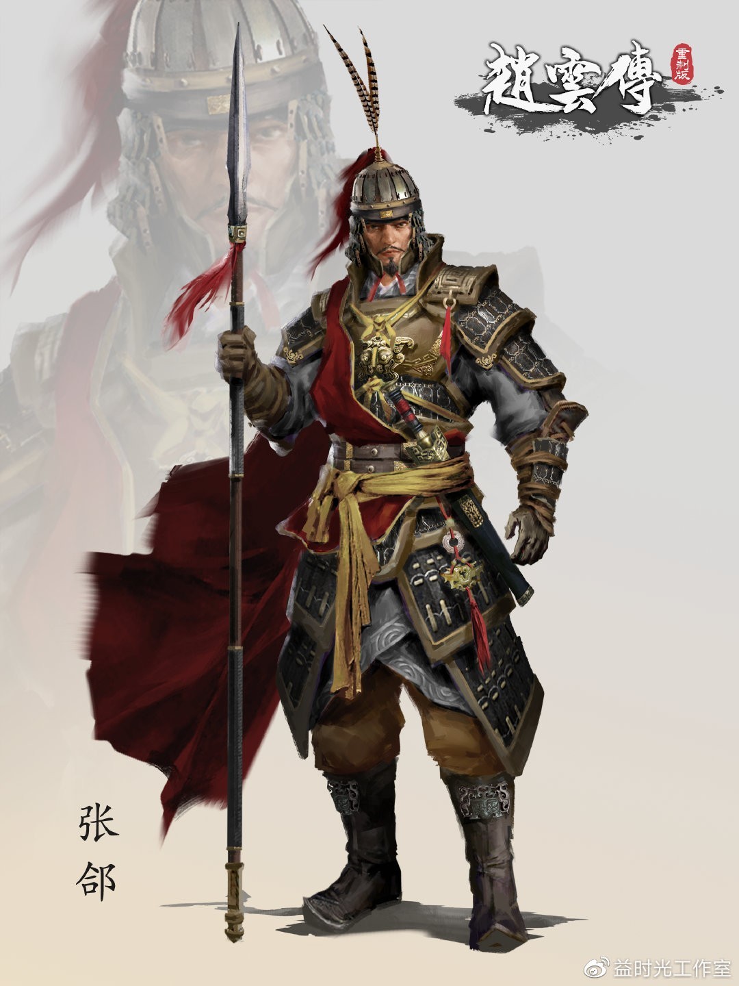張郃同樣是袁紹舊將,在官渡之戰後投降曹操,在曹操陣營中屢建奇功,直至三國後期戰死在魏蜀戰場。張郃在袁紹陣營發跡,成名於曹操陣營,作爲曹軍大將與趙雲在新野大戰中多次遭遇。張郃無論是用兵還是做人,均善估形勢而巧變,正因爲此個性,其在曹營中得委以重任。《趙雲傳重製版》中,張郃的原畫形象貌然站立,形象持重,冷靜而不動聲色,氣息肅殺,以體現張郃冷靜的性格。