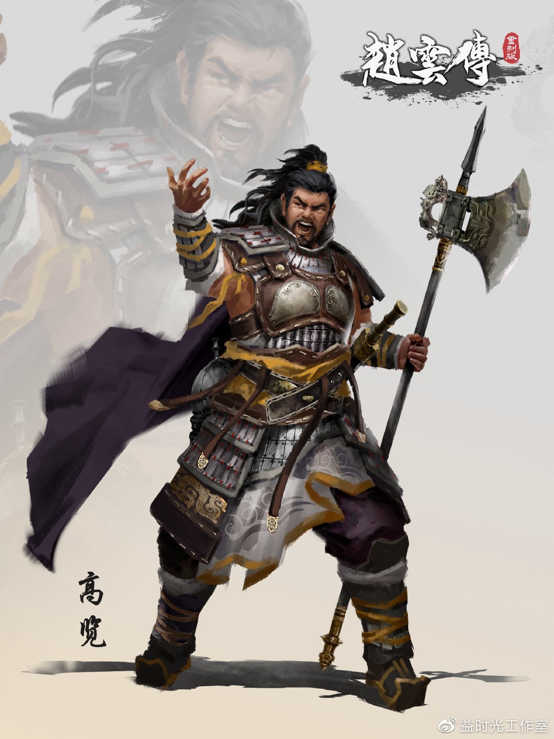 高覽是袁紹舊將,在官渡之戰後投降曹操,在《三國演義》中曾與許褚、徐晃大戰不分勝負,武力高強。劉備敗走荊州時,高覽奉命追殺,被趙雲長槍刺死於馬下。高覽個人武力值超羣,《趙雲傳重製版》中高覽原畫設定手持巨型斧鉞,凸顯強大的武力壓迫,面部表情揮灑狂嗥,以體現高戰力武將的得意與霸氣。