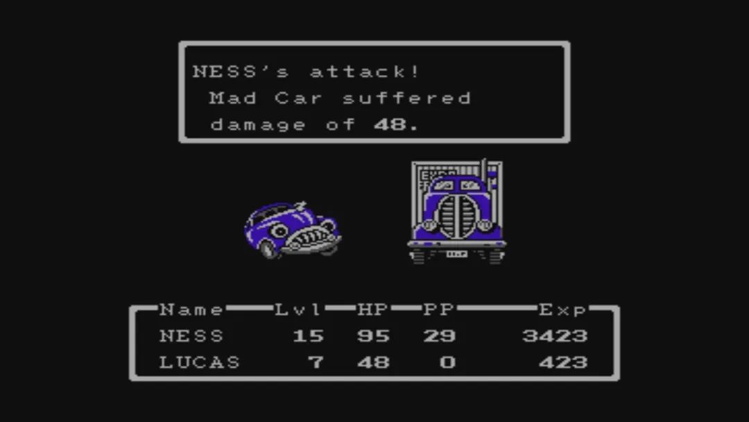 遊戲的主角在野外會隨機遇到敵人,甚至在某些城鎮的避難所也有遭遇戰,戰鬥採用了回合制形式,視角類似第一人稱,只顯示敵人和我方指令菜單。雙方根據速度數值決定順序輪流行動,除了常規的普通攻擊外,最重要的就是名爲PSI的超能力系統,類似我們熟悉的魔法,包括了傷害輸出和治療等多種功能,根據效果分成了Alpha、Beta、Omega等不同級別,除此之外守衛指令可以提升角色防禦力、檢查指令可以獲悉敵方弱點、逃跑指令可以撤離戰鬥,如果覺得麻煩還可以將戰鬥設置爲自動模式。