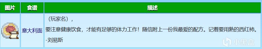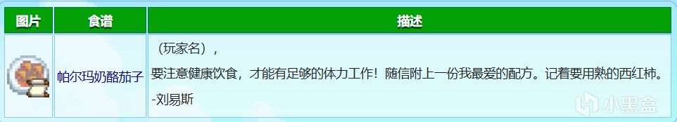③當我們與劉易斯好感達到七心時,會收到他通過郵件寄來的食譜:帕爾瑪奶酪茄子,能夠加1的採礦等級和3的防禦