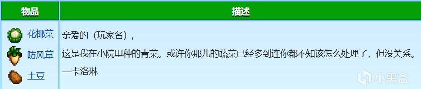 ①只要我們和卡洛琳好感度大於0時,就有概率收到她通過郵件贈送我們的花椰菜、防風草和土豆,好感越高,幾率越大