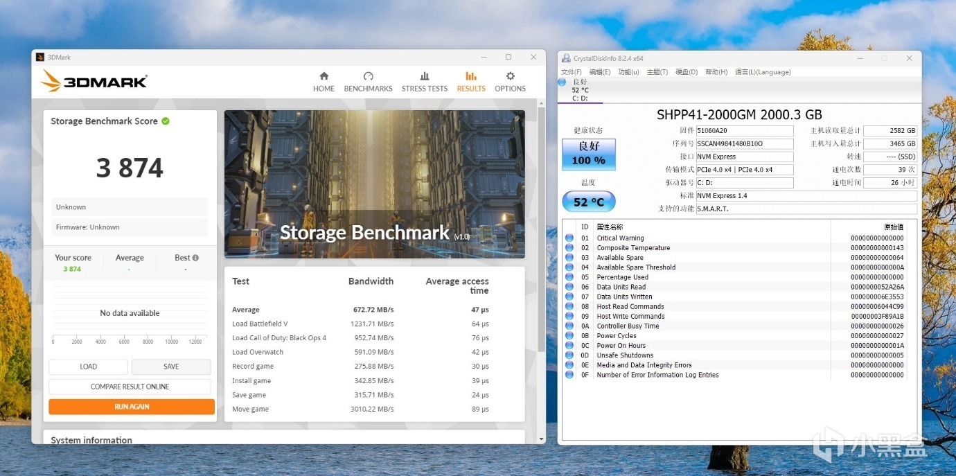 3DMARK 存储测试,为了更加准确的测试。我们克隆了一套软件系统到这块海力士硬盘,然后使用这个硬盘单独测试。这个测试是以多个游戏加载进行的测试,(包括加载游戏、保存进度、安装游戏文件和录制游戏视频流),耗时较长,比较能反映真实游戏场景下的表现。 最终得分3874分,十分出色。通常的话根据统计普通硬盘得分只有2450分左右。