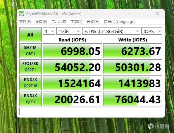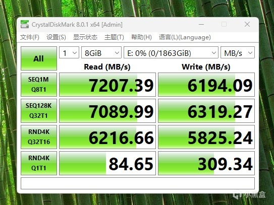 8GiB下的测试,读取7207MB/s,写入6194MB/s,同之前比基本持平,表现十分不错。