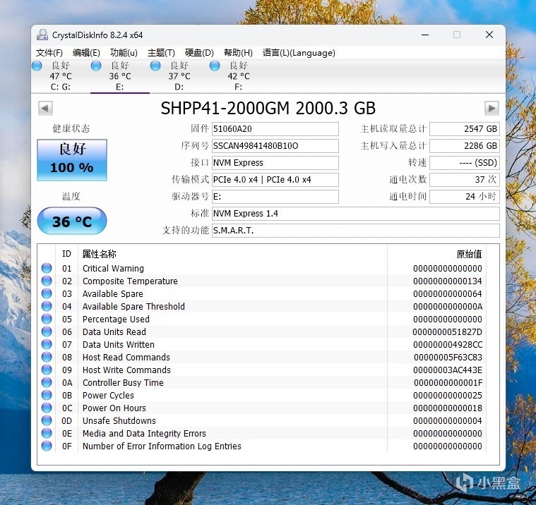 运行CDI软件,我们看到这款海力士NVMe SSD硬盘的传输模式是PCIe 4.0x4,NVM Express 1.4标准。我们看硬盘写入量有2286GB了,这是因为这个图是在连续做了很多测试后截图的,我们看待机温度也很稳定,仅36度。