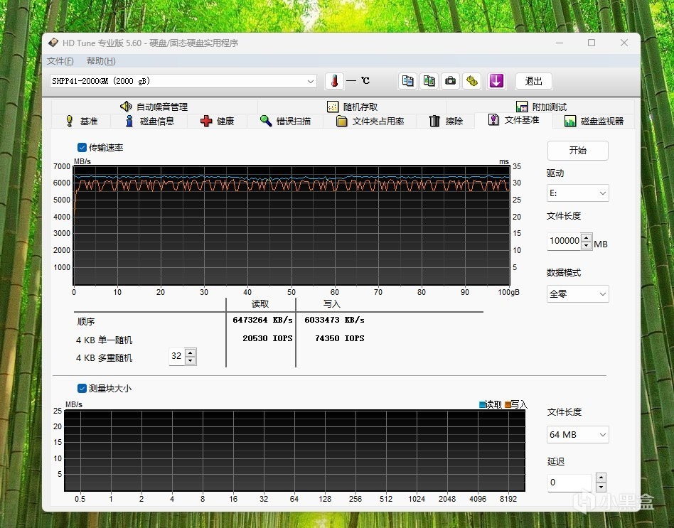 使用HD Tune Pro测试硬盘读写,100GB的文件读写,数据表现十分稳定,在6000MB/s以上。这是得益于独立的DRAM缓存,数据波动很小。
