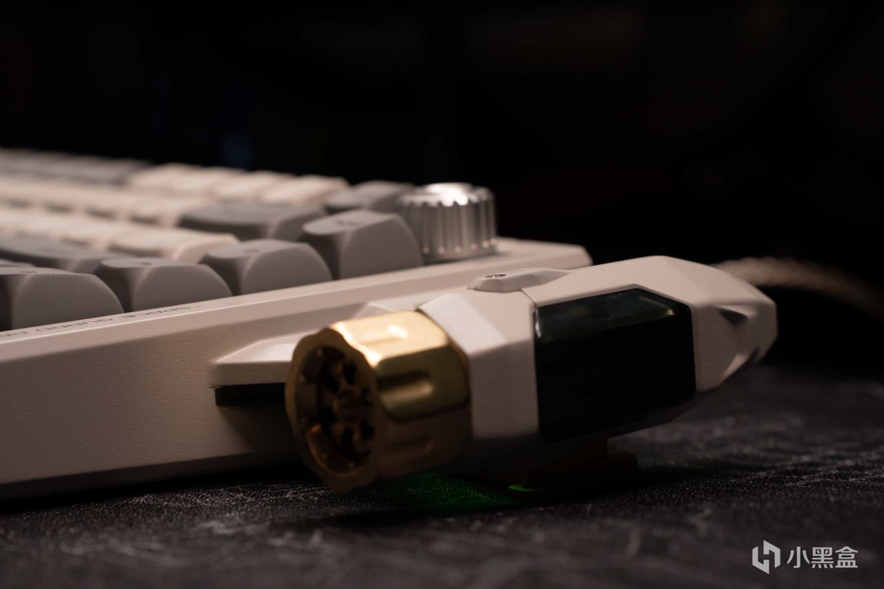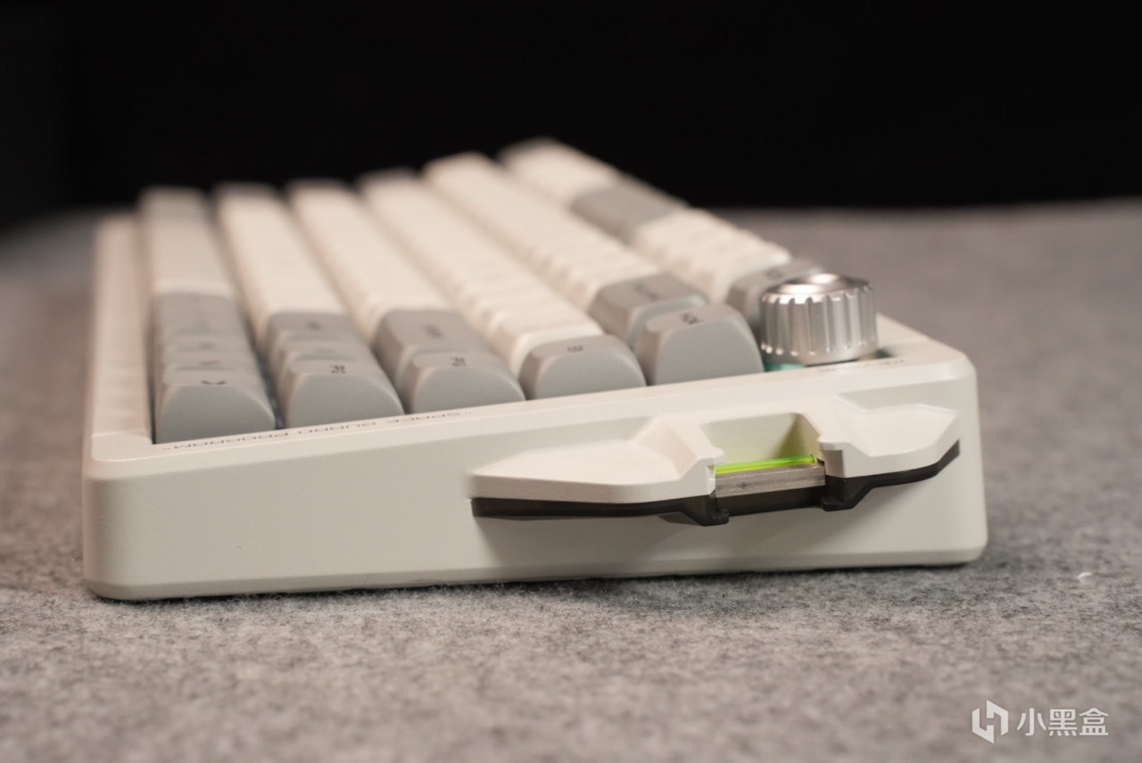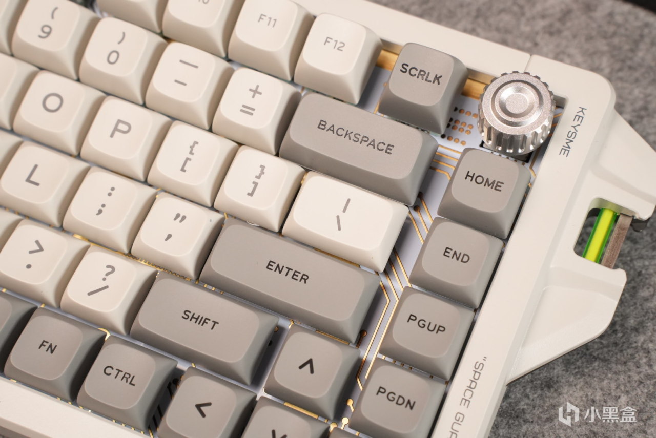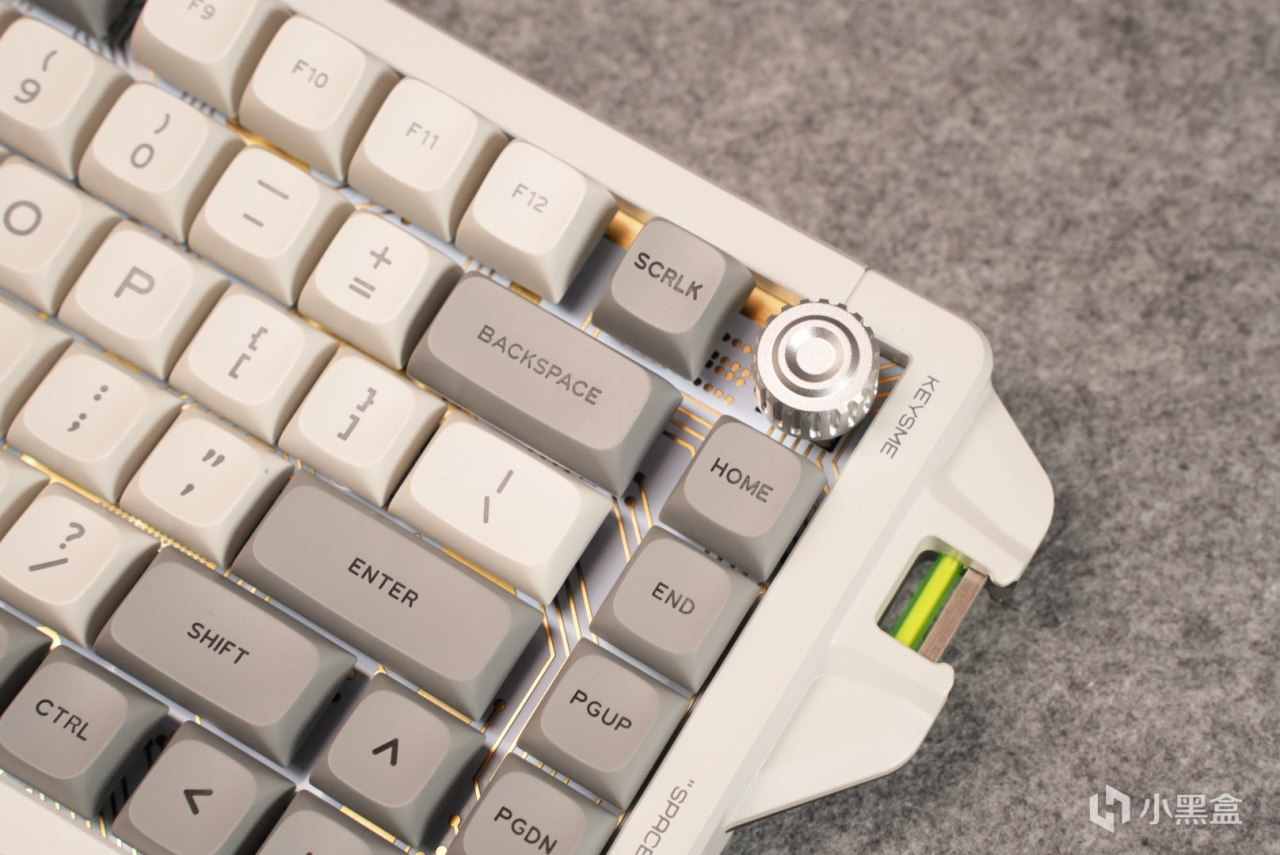在键盘的右上方,这款75相对于其他产品的75配列来说,AIM 04做了一个旋钮的设计这个旋钮对于我这种人来说是比较重要的,因为不同平台不同的游戏有的声音设置的不一样,所以旋钮对我来说还是很重要的。