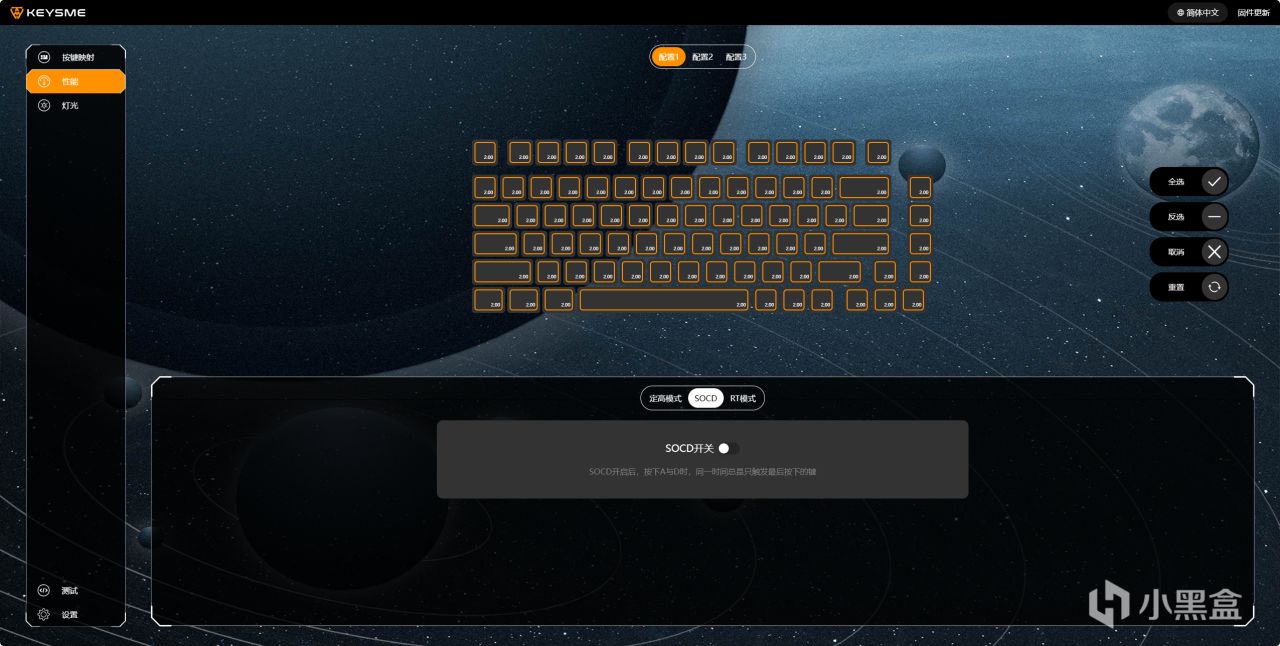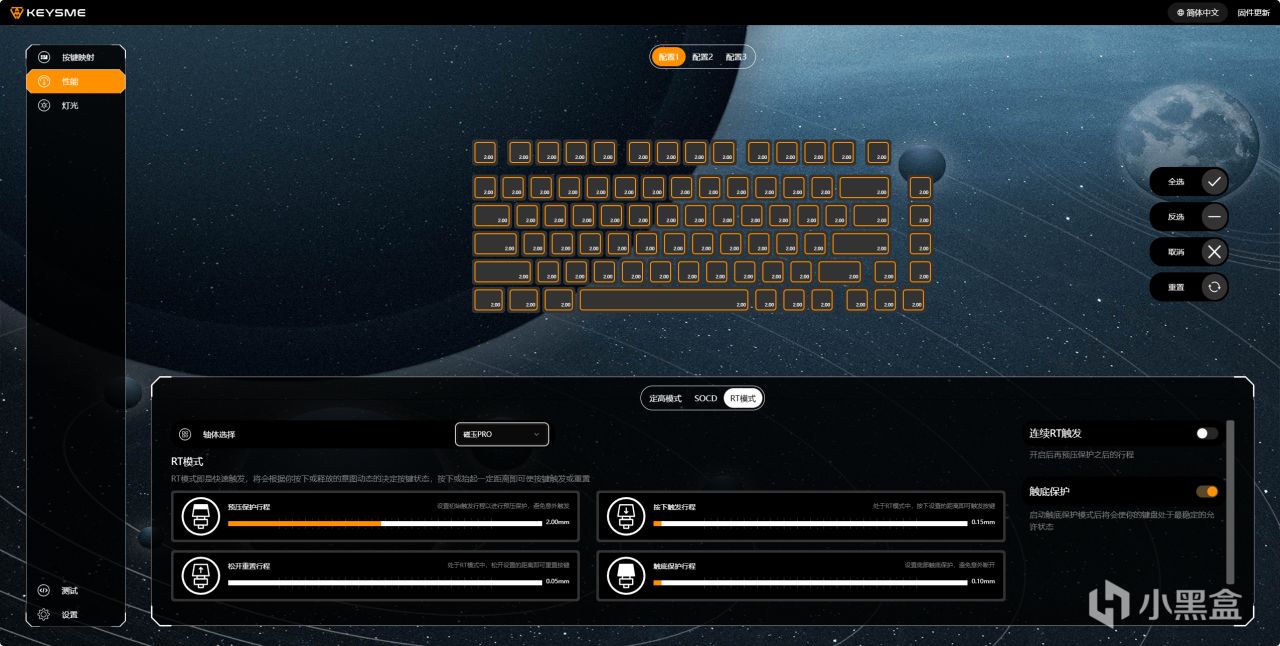 但是磁轴键盘最重要的其实还是键盘的rt驱动部分,在驱动部分我们可以看见有三种模式,这里我一一的跟大家说一下,首先就是定高模式,这个模式简单的来说就是模拟正常的机械轴体的出发原理,有一个固定的触发点的设计。第二个SOCD模式,简单的来说就是他可以设置两个按键,比如按下A和D两个按键,A按键会被取消触发转而D按键正常触发,这对于CS2急停的这种操作很有帮助(CS2一个月之前更新了一次,ban掉了大多数的磁轴功能)再就是我们最熟悉的RTR功能,这个功能其实用磁轴的朋友门很熟悉了,但是新来的朋友还是有一些不熟悉,这里我还是一一介绍一下,首先来说就是预压保护行程,这个就是设置rt完之后第一下按下会有一个按压保护,之后按压才会正常触发rt,按下触发行程是指的rt功能的正常设置,就比如我设置0.15的触发,在我按下到达0.15的时候键盘轴体会触发。再就是松开重置行程,这个就是按下之后抬起多高可以在重复触发的,很简单来说就是假如我按下了0.2mm触发了这个按键,然后我设置了松开行程为0.05,那么我抬起0.05之后我又可以在按下重复触发。最后一个简单来说就是一个触底保护功能,就是一个死区保护。