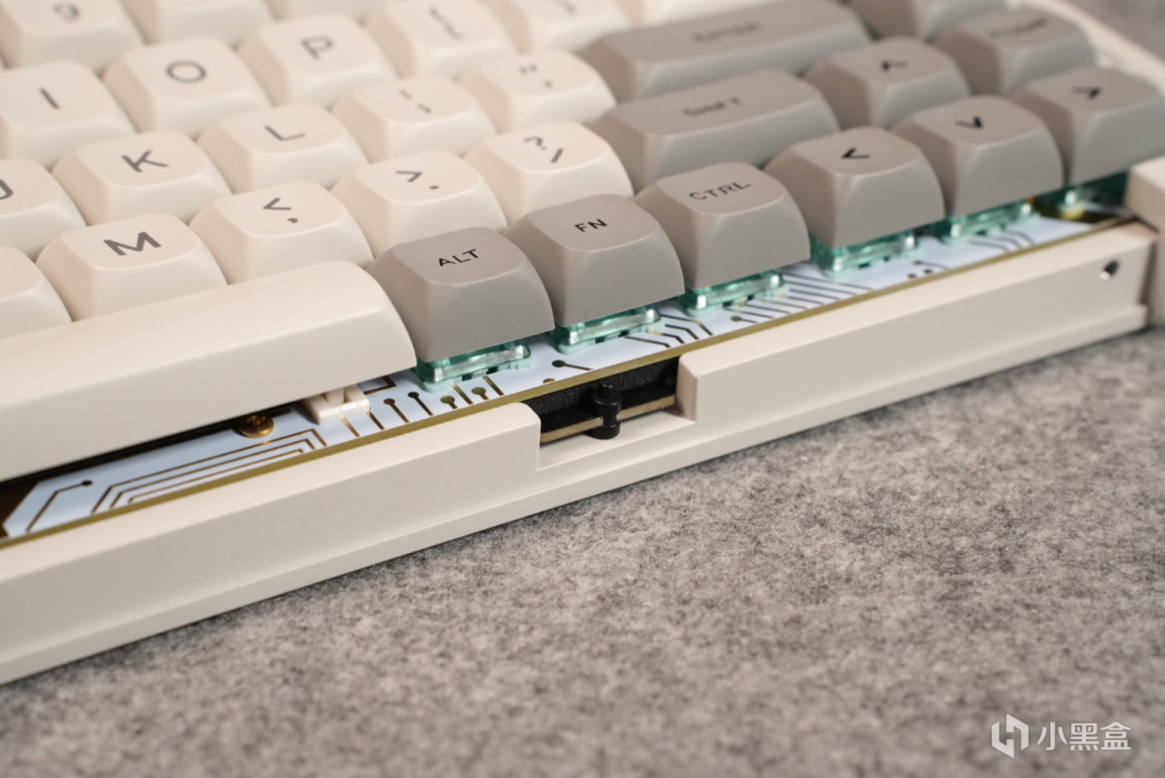 键盘定位板方面做了一个悬浮的设计,FR4的定位板并且在上面做了沉浸工艺,露出的图案是金色线条,让键盘的设计感大大的增加,虽然平时有键帽的阻挡,但是隐隐约约的可以看见电路的设计也是很帅的。