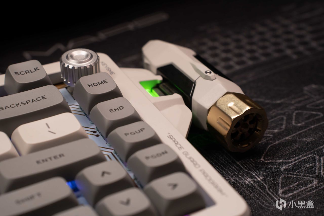 键盘斜度设计的很不错,在不用手托的情况下也可以完美使用,但是其实我更喜欢用手托,键盘两侧向外延伸做了一个磁吸的设计,可以将他家配套的小火箭装饰磁吸上去,通电后搭配着灯光,可以说是十分的好看。
