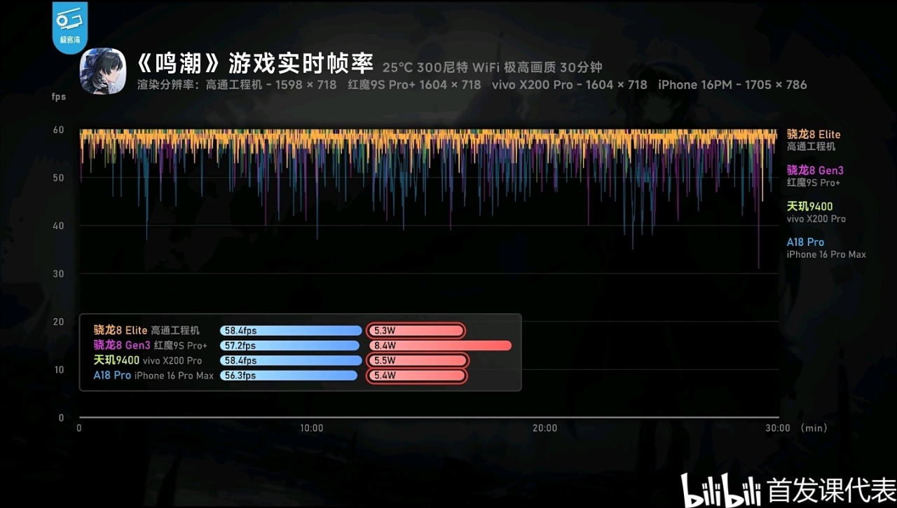 ◆ 驍龍8Elite工程機,於該項目中平均幀率高達58.4幀,功耗僅5.3瓦!