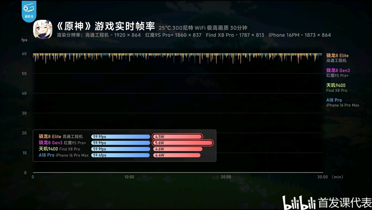 ◆ 驍龍8Elite工程機,於該項目中平均幀率59.9幀,平均功耗僅4.5瓦!