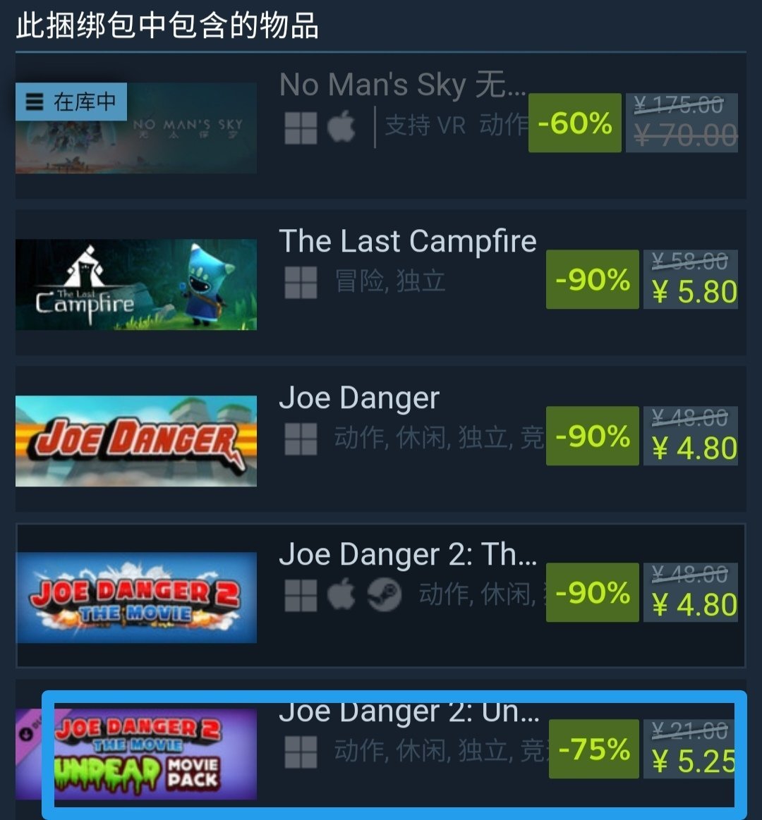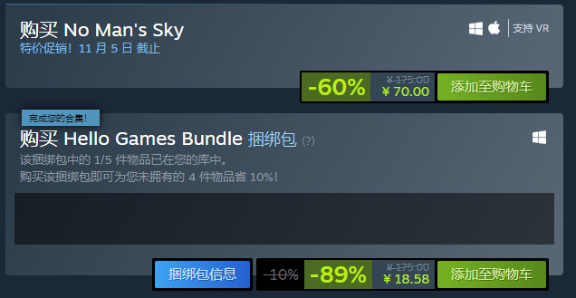 ②:捆綁包:Hello Games Bundle廠商捆綁包,包含《無人深空》➕另外三款遊戲以及一款DLC,如下圖所示(注:我這邊顯示18.58是因爲《無人深空》我已經有了,所以看着很便宜。)