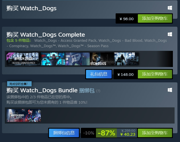 ③捆綁包:包含《看門狗》《看門狗2》《看門狗:軍團》(我這裏顯示便宜是因爲1、2代我已經有了)都是標準版
