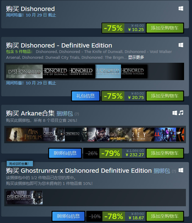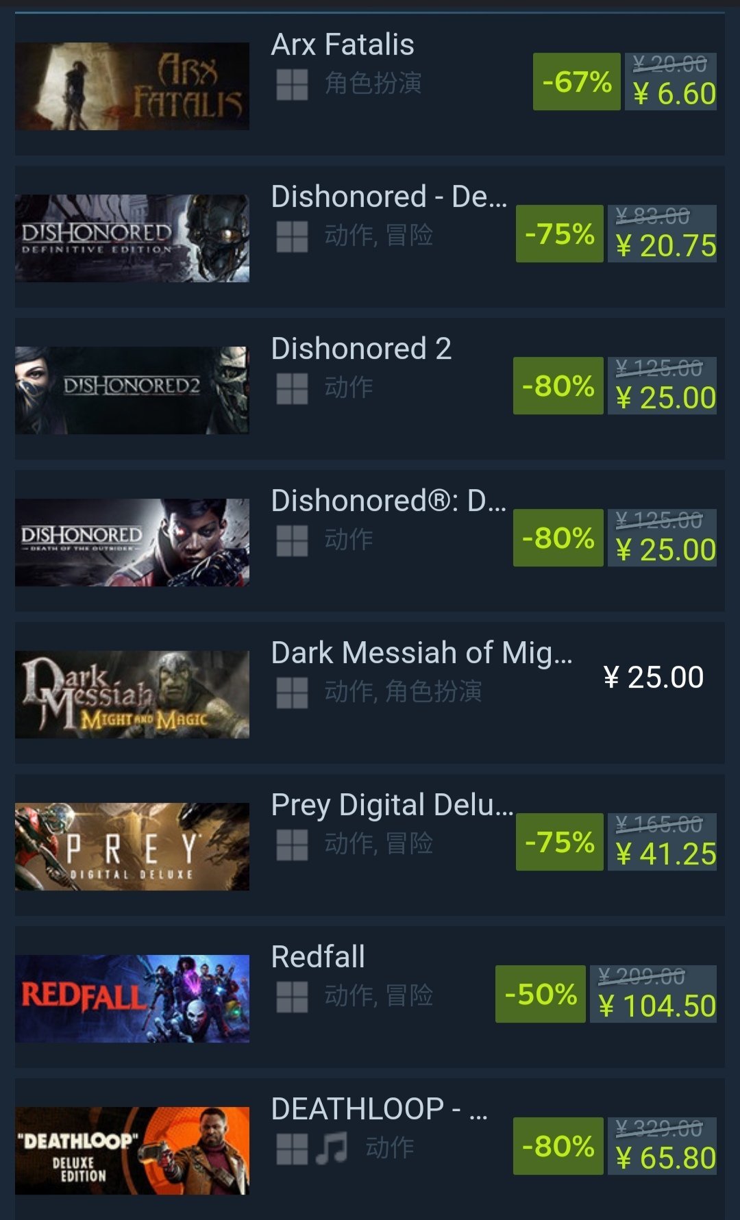 ③Arkane廠商合集,這個裏面遊戲就比較多了,不單單隻有恥辱,具體參考下圖所示。