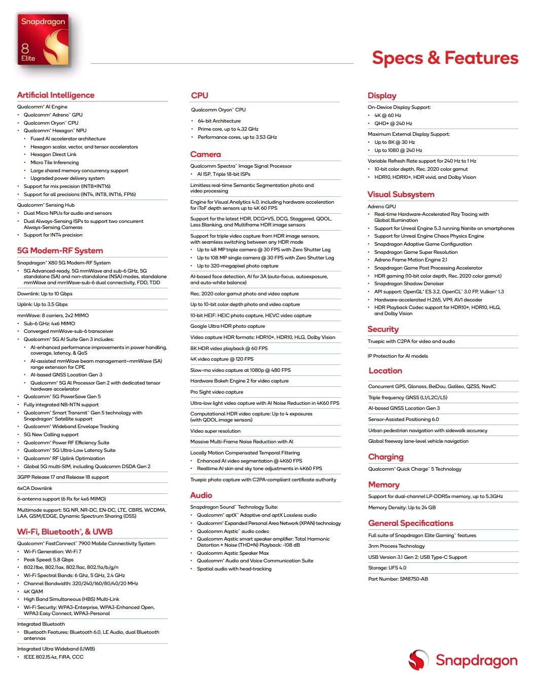 ◆ FastConnect 7900 移動連接系統:支持 Wi-Fi 7 並集成 AI,峯值速度可達 5.8 Gbps,功耗降低 40% 以上;支持具有空間音頻和 ANT+ 功能的藍牙 5.4 標準,Wi-Fi 測距和藍牙信道探測等功能,並支持擴展個人區域網絡技術 (XPAN) 和驍龍無縫連接 (Snapdragon Seamless)。支持高頻段併發 (HBS) 標準,可在設備和配件之間實現低延遲的即時連接,業界首款將 Wi-Fi、藍牙6.0和超寬帶連接集成到單個 6nm 芯片中的解決方案;