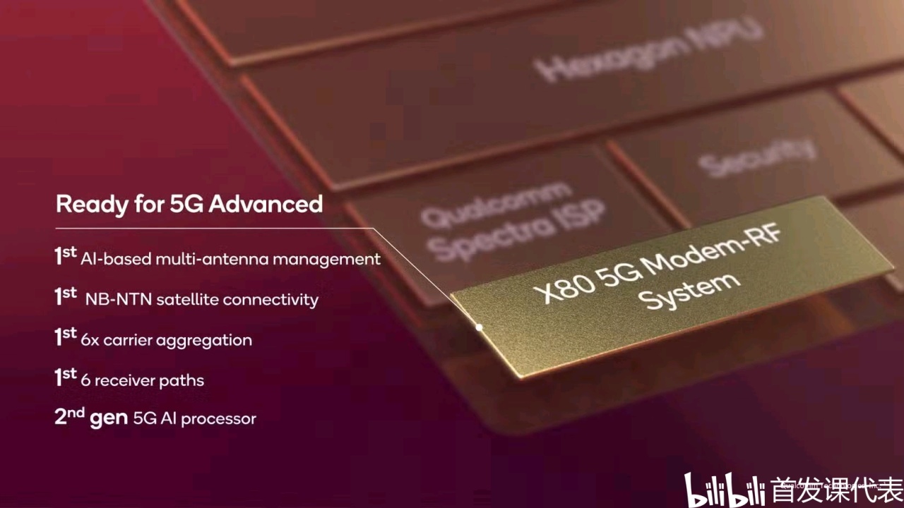 ◆ 5G 調制解調器:驍龍 X80 5G 調制解調器,首次面向智能手機支持 6Rx,下行鏈路速度高達 10Gbps,上行鏈路速度高達 3.5Gbps,毫米波連接下的定位精度提高 30%,最佳單元選擇時間縮短 20%,功耗降低 10%。不僅是首個提供“基於人工智能”的天線管理系統,同時還是首款集成 NB-NTN(衛星)支持的 5G 調制解調器;