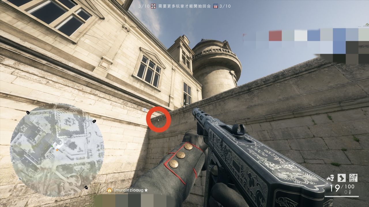 配备也和武器的选择一样,必须注意它们的特性。以炸药举例,想玩炸药就先要学会扔滑铲炸药,不然普通地扔距离过近根本丢不到该炸的地方,而且如果你带了难以察觉可以滑铲扔直接趴下再引爆,这样你不会出现在敌人小地图上,如果有烟雾弹还能给你打掩护更不容易被发现。再以毒气弹为例,毒气可以穿墙,这是其他手雷做不到的,那么我们可以利用它来判断点内是否安全,拐角处是否有人。在宴厅中如果你是德军,你们要进攻c点,你在图四的位置(图一已标出3),你可以在图四我所瞄的地方丢出一颗毒气,效果如图五所示,如果有受击反馈自然是有人。你可以由此在没有信号弹的情况下来判断步兵位置。同样,这部分也仅仅提供思路,供大家参考,更多玩法需要去探索,掌握自己的技巧。