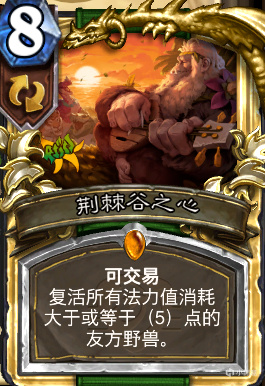 都说猎人橙卡百无一用,但这张棘刺谷之心反而很契合野兽蛋猎,主要是它和我们的卡组能产生太多联动了,其自带的交易机制使得哪怕开局抽上手了也可以快速换掉去抽蛋。最重要的是它的效果,我们的牌库里的所有野兽卡都是起步五费以上的,保证了我们蛋里找到的随从能百分百通过棘刺谷复活,这张卡通常是打战士或者dk等解场强的卡组才能打得出来,和炫目演出者在萨满卡组里的作用相同,搭配上王··鹦鹉的话我们就能铺两回合场面,属于背水一战性质的卡,两波结束还没打死就意味着该投降了。