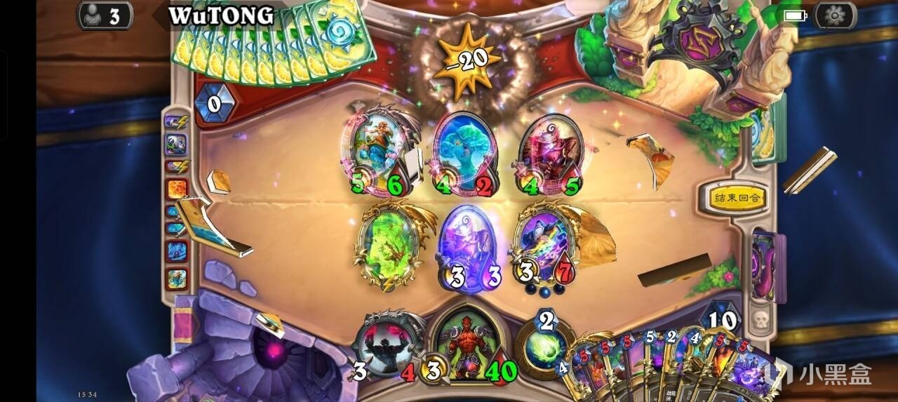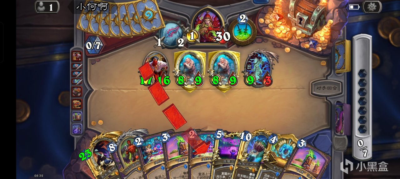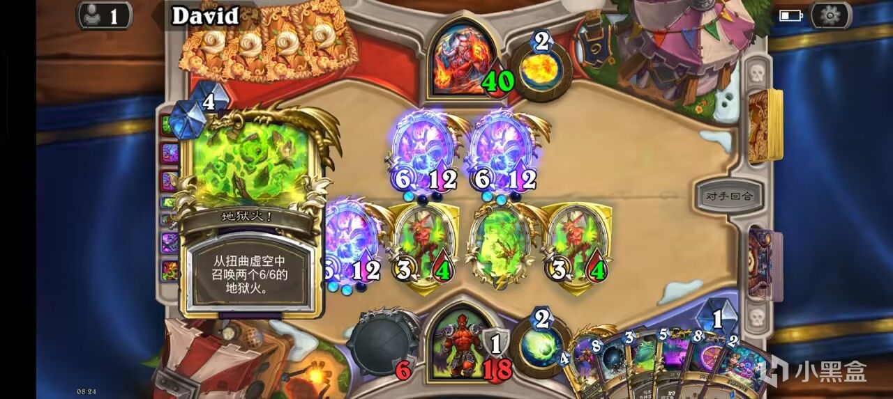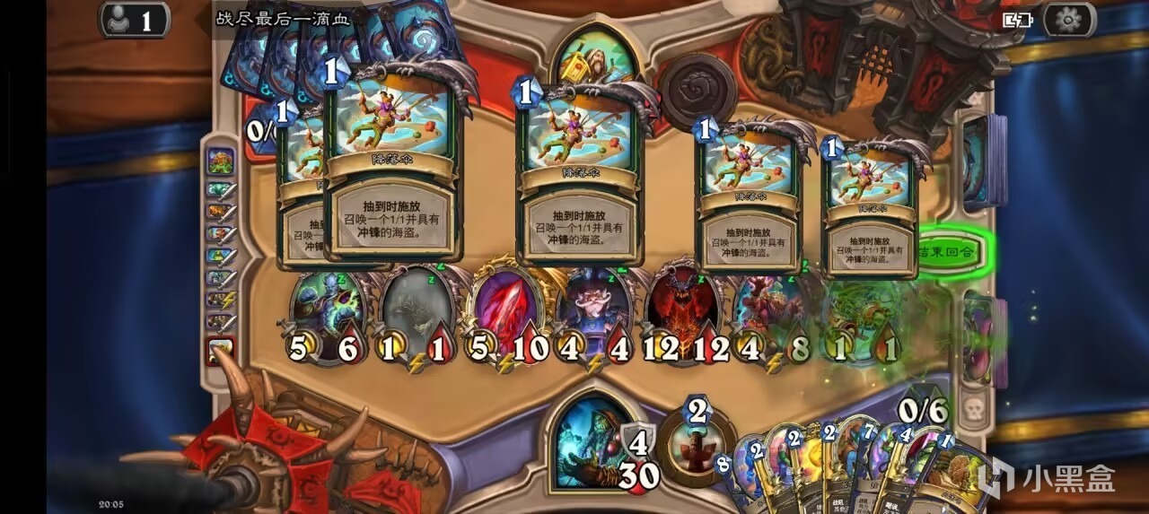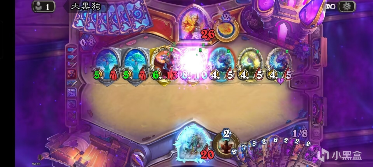后期开了轮盘后我们可以用术士泰坦+大王每回合召唤一个6/6+两个3/4嘲讽小鬼,搭配上术士的两张一费礼物,足足有四张扭曲虚空,撑过轮盘的五个回合要求可谓是绰绰有余了。