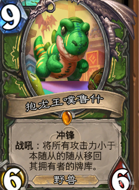 打中速卡组:打中速卡组时我们需要围绕着可爱的抱龙王(喜欢我冲锋踢你脸吗?)展开,从蛋里找出来时五费刚好是中速卡组的发力期,这张卡在打法术法以及多系萨时有奇效,可以把萨满一地小卡拉米和吉安娜的水人洗回他们牌库污染他们的抽卡。