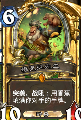其次是香蕉,有很多人觉得给对面塞香蕉是debuff,其实不然,在我们打下突袭猩猩后就意味着我们可以稳定解掉对面的场让对面没有随从可buff(基本上会buff我们的随从),并且香蕉本身也是需要1费的,在7、8、9费的关键时期打了香蕉就意味着断了节奏,不打就会被卡手牌,因为猩猩是填满对面手牌的,所以我们可以100%爆对面一张牌。运用这种特性打战士以及德鲁伊时,能保证他们手牌里无法及时填充新的解牌,愉快踢死他,德鲁伊要是敢下龙巢我们每回合拍个猩猩那他的龙巢四舍五入就废了。
