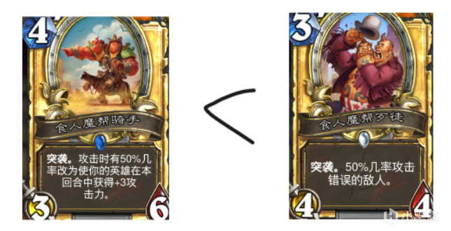 这套卡组唯一需要注意的一点就是不要带怯战蜥蜴(食人魔帮骑手),比起赌百分之五十的+3攻击力去斩杀对面,倒不如赌一傻子能踢对面的脸(四舍五入复活了个冲锋),再不济也是随机挑对面一个随从踢,而不是要你的英雄亲自下场,傻子贼难就难在如何苟过前期,三费四杠四无论从哪个角度来说都要比四费顺滑的多。