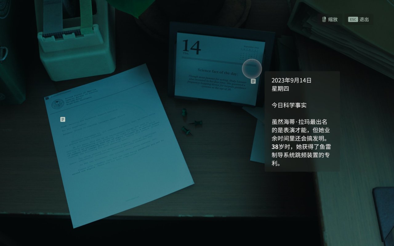 在獲取地圖後,我們進入了辦公室。注意到備忘錄旁的日曆上顯示了一系列不斷變化的數字。特別是,今天的日期旁邊標註了一則信息,提到女演員海蒂·拉瑪在38歲時不僅是一位發明家,還設計了一種魚雷制導系統。(我們意識到不能使用實際的日期,因此儘管日曆上顯著的“14”號可能很吸引人,但我們不能使用它,所以,我們只能使用數字38。)