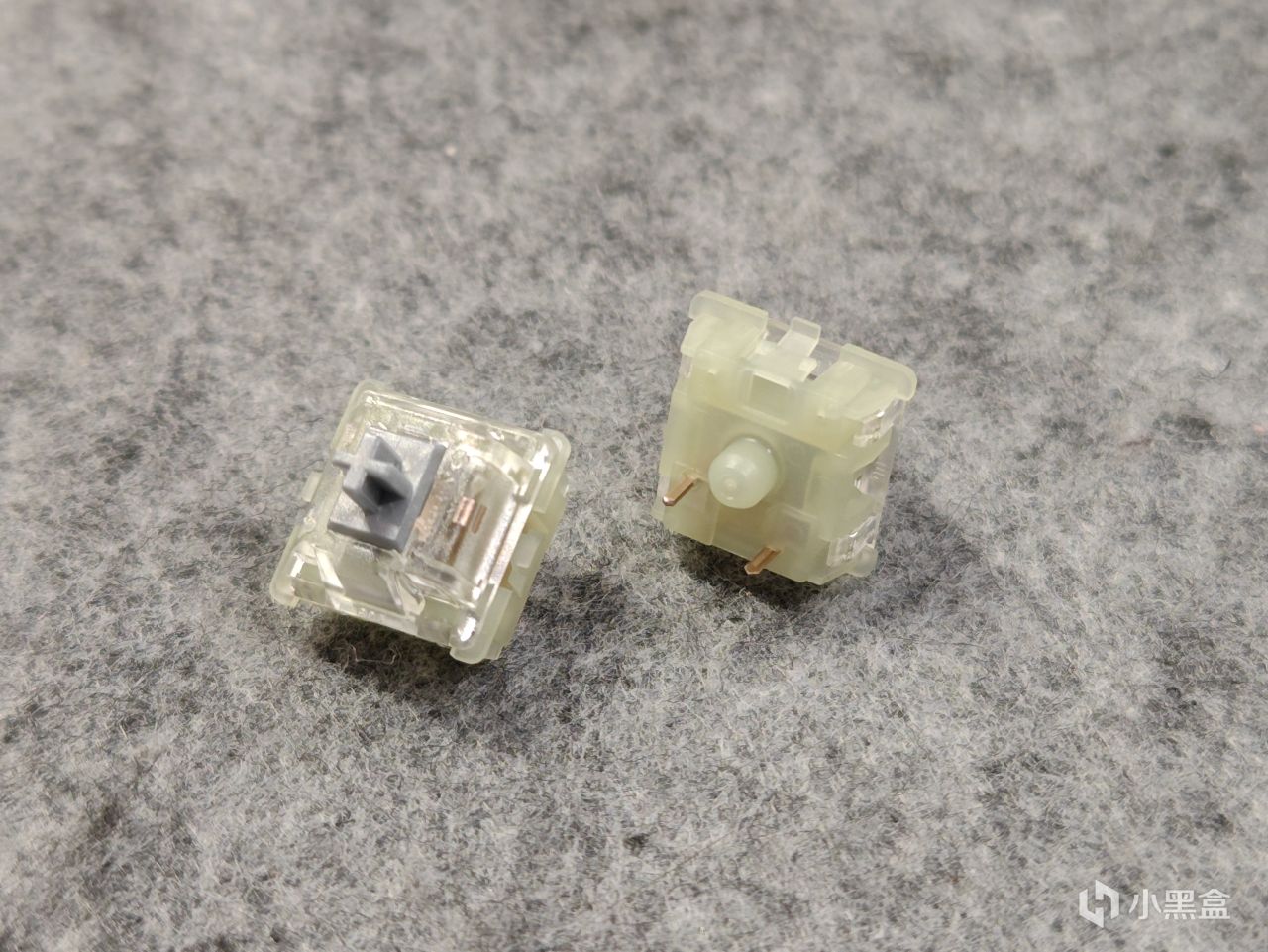 我手裏的MX2A軸爲兩針腳設計,觸點表面有抗氧化的鍍層,它就是鏈接軸體內信號通斷的橋樑。機械軸由於金屬彈片結構都相對複雜,其長期使用可能會由於進灰和老化,從而造成雙擊等故障,並且也較難清理。但是機械軸的多樣性和可玩性是其它不同原理軸體(光軸,磁軸)難以匹敵的。