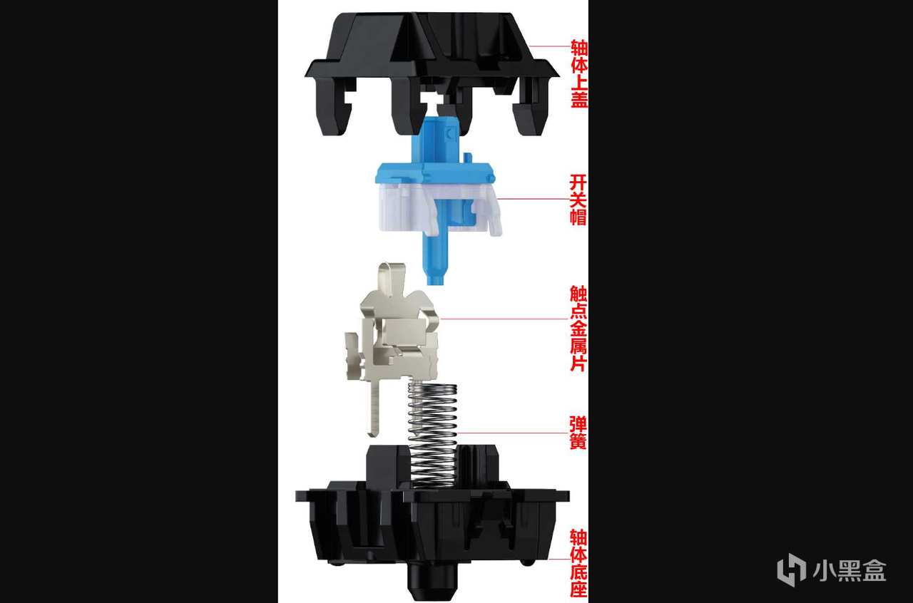我們通常所說的機械軸它一般是由上蓋、軸心、彈簧、金屬觸點和底座構成。原理很簡單,就是依靠依靠金屬觸點通斷來實現按鍵的觸發。