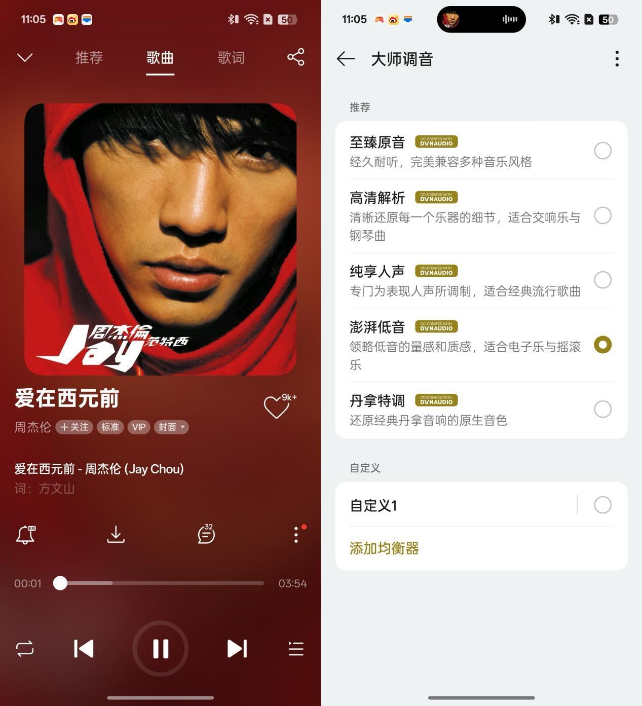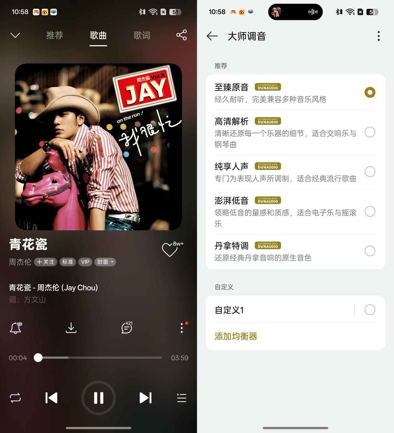 第二首選擇的測試歌曲爲周董的《青花瓷》,此時將大師調音設置爲至臻原音,可以聽到高中低三頻電子樂器與人聲相融合的平衡感,背景樂和人聲都能聽到,不像純享人聲刻意增強了人聲部分。