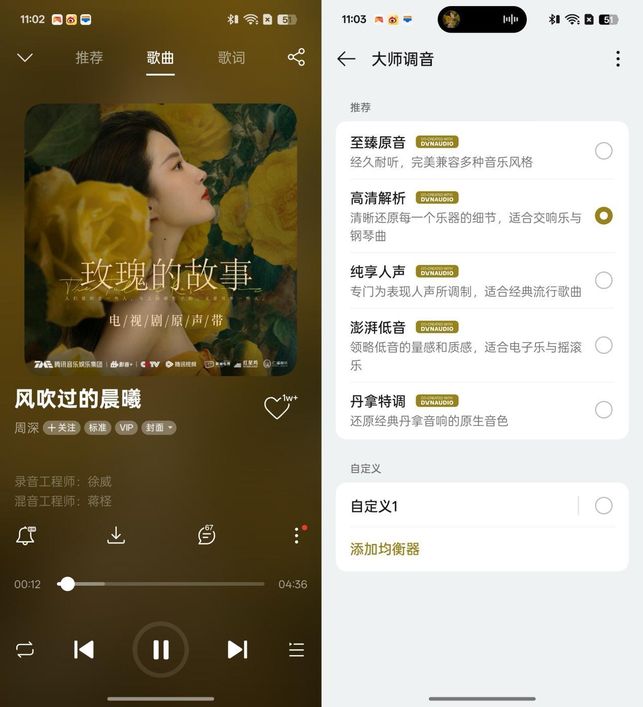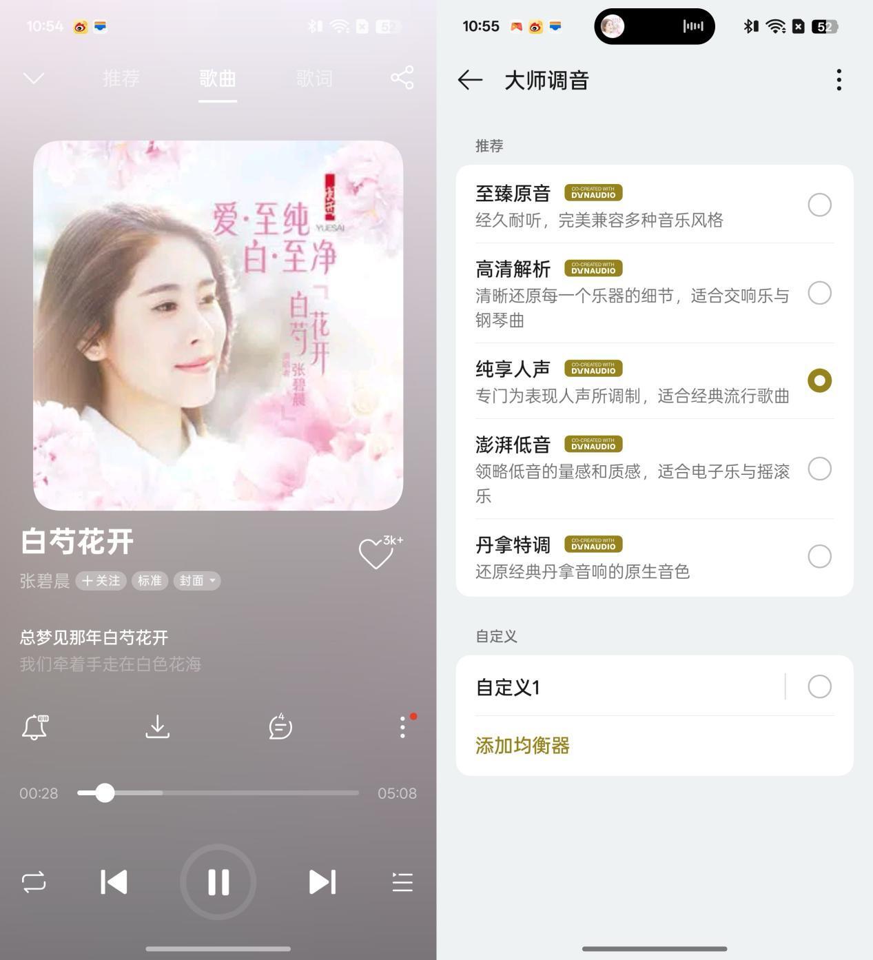 耳機開啓黃金聽感和空間音頻、大師調音設置爲純享人聲,播放張碧晨演唱的《白芍花開》,可以聽到層次豐富的女聲,聲音細膩且乾淨。