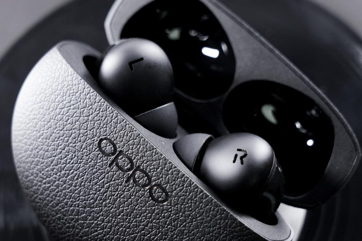 OPPO Enco X3擁有很高的辨識度,耳機充電倉正面和背面都覆蓋了一層黑色素皮材質,表面的皮革紋路搭配黑色的OPPO logo,無形中流露出了一種低調深邃的高級感。