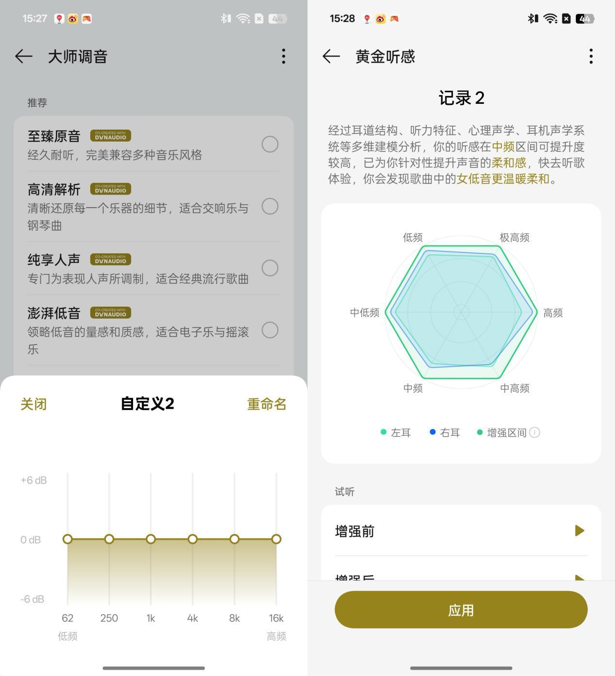 至臻原音兼容多種音樂風格,適合懶得手動切換調音風格的用戶;純享人聲適合以人聲爲主的流行音樂,聽感上對人聲進行了增強;高清解析可以還原每個樂器的細節,比較適合交響樂和鋼琴曲;澎湃低音適合喜歡聽電子樂或搖滾樂的朋友;丹拿調音主要還原了百年丹拿音響的原生音色。