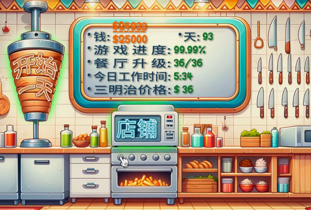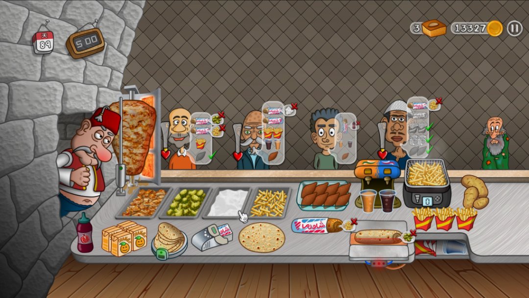 遊戲儘可能簡化了烹飪過程,但大多數步驟均需手動操作、反覆點擊或拖拽。切肉、切土豆、炸薯條、提醒紅鼻子老頭備齊其他材料,再將烤肉、黃瓜、疑似大蒜醬的白色醬料,以及薯條四種配料填入餅中——這一切起初都需要玩家親手點擊來操作。
