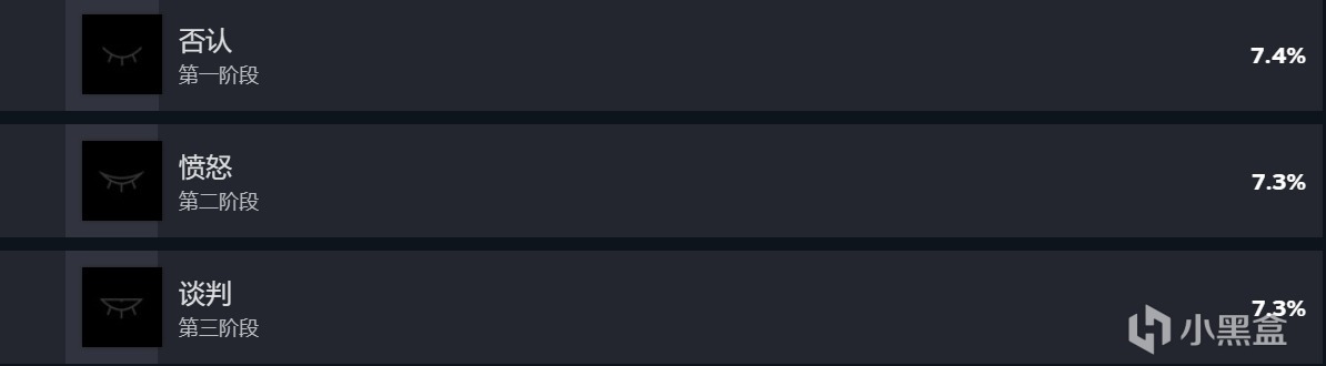 游戏中的5个隐藏成就名称分别是“否认(第一阶段)、愤怒(第二阶段)、谈判(第三阶段)、沮丧(第四阶段)和接受(第五阶段)”。