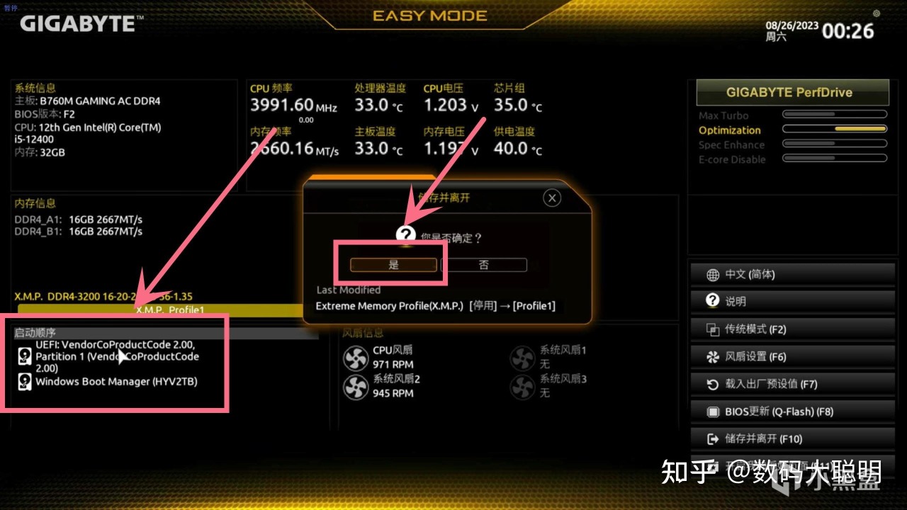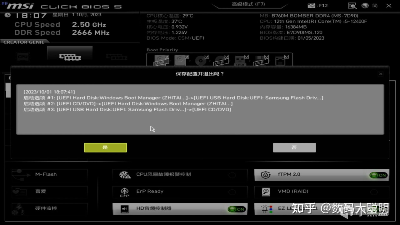 注意我們原本的啓動順序模塊也顯示器UEFI引導盤在第一位了,此時按鍵盤F10按鍵,點擊「是」,保存BIOS設置後的電腦重新啓動進入安裝階段