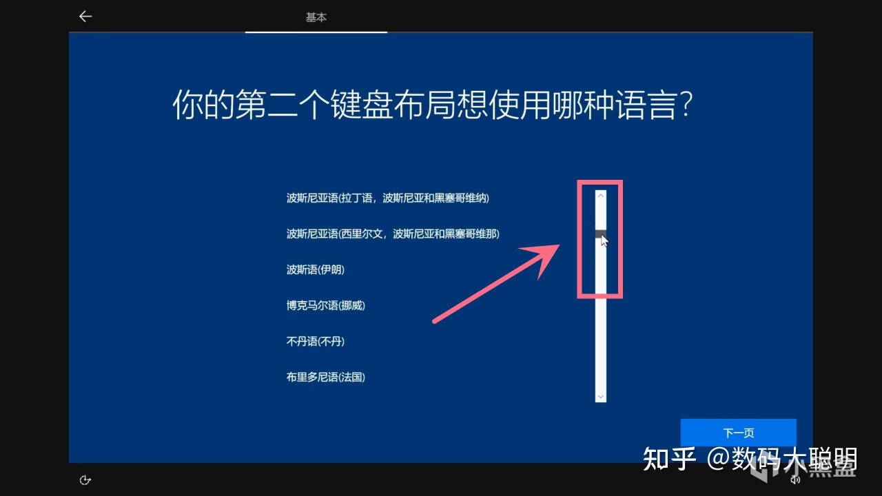 這個頁面選擇鍵盤語言,在右邊的進度條那裏,鼠標左鍵選中黑色的模塊,拖動它往下拉