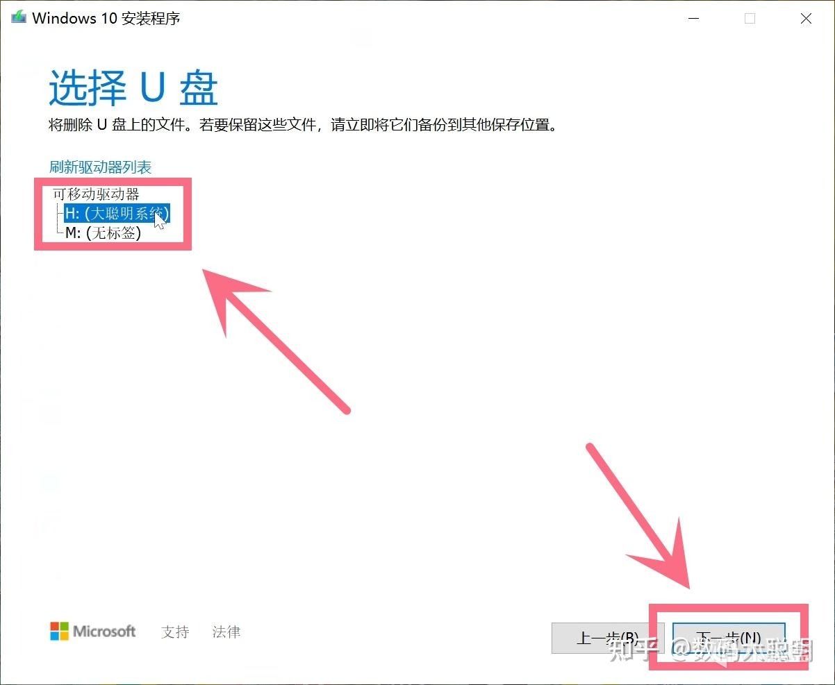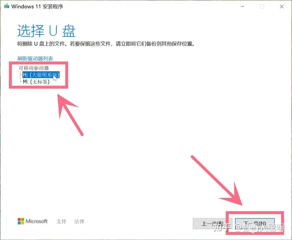 在驅動器列表中,選擇用於製作安裝盤的U盤,點擊「下一步」
