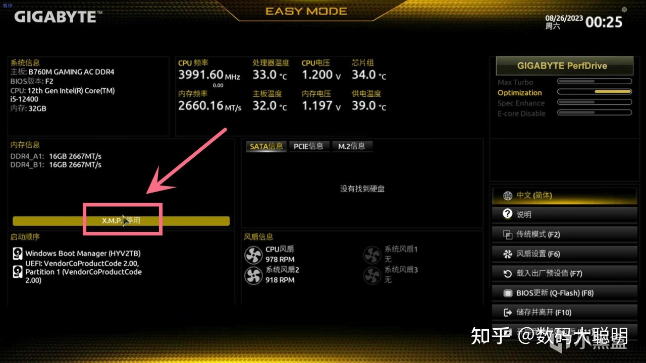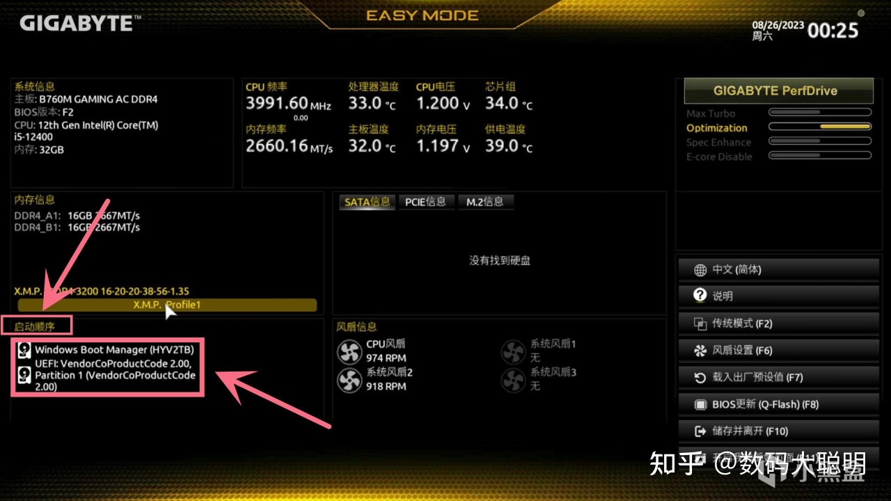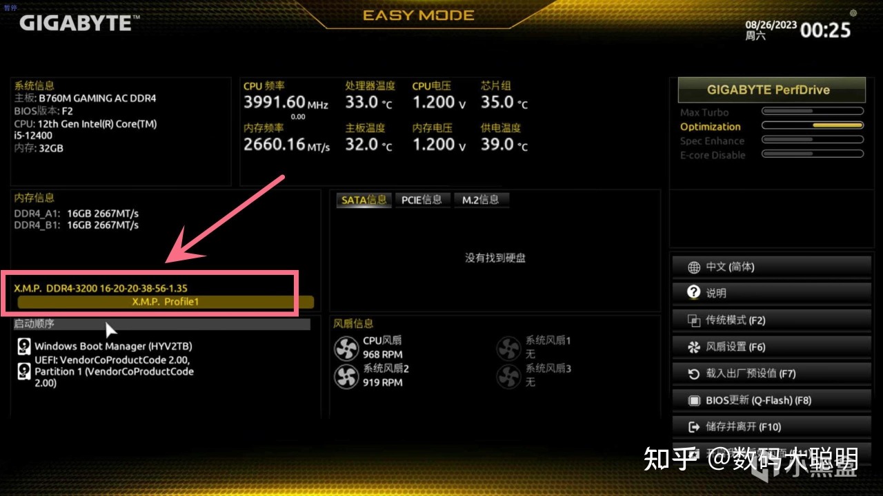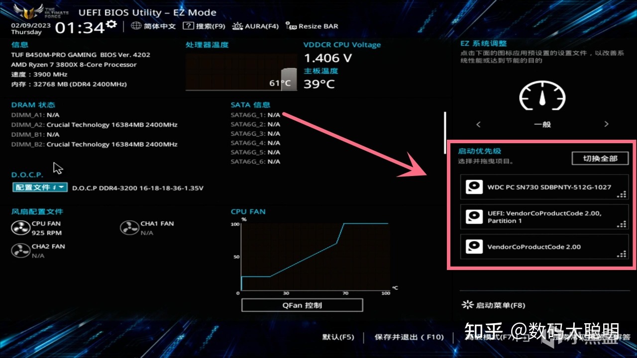此時華碩的XMP已經打開,同樣的位置會顯示出內存默認的XM設置,在右側「啓動優先級」模塊處,會顯示系統檢測到的硬盤