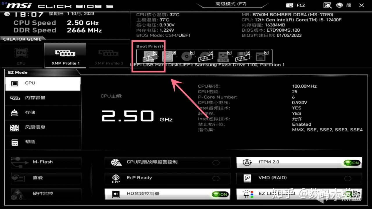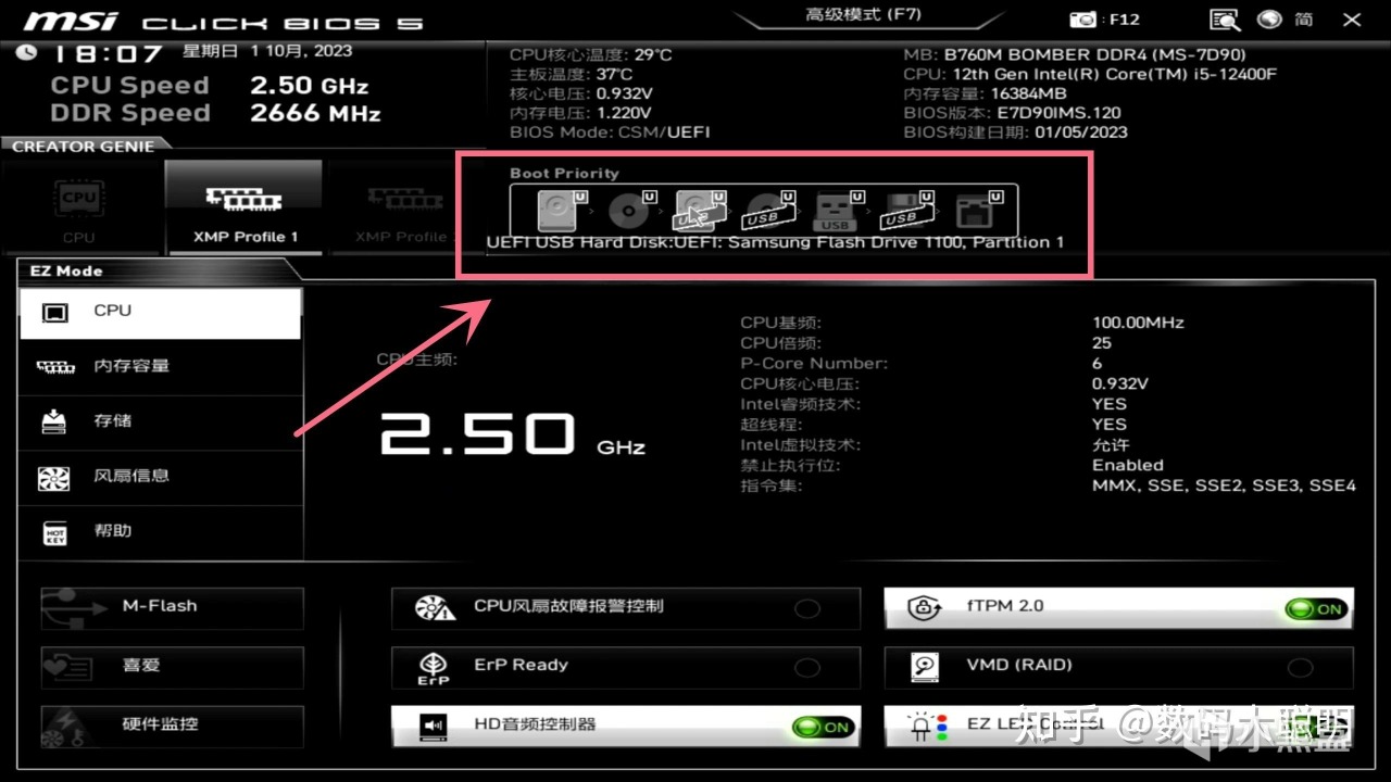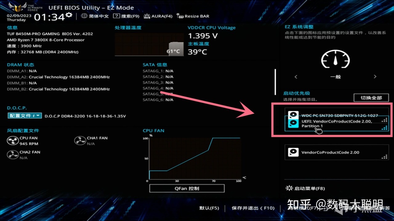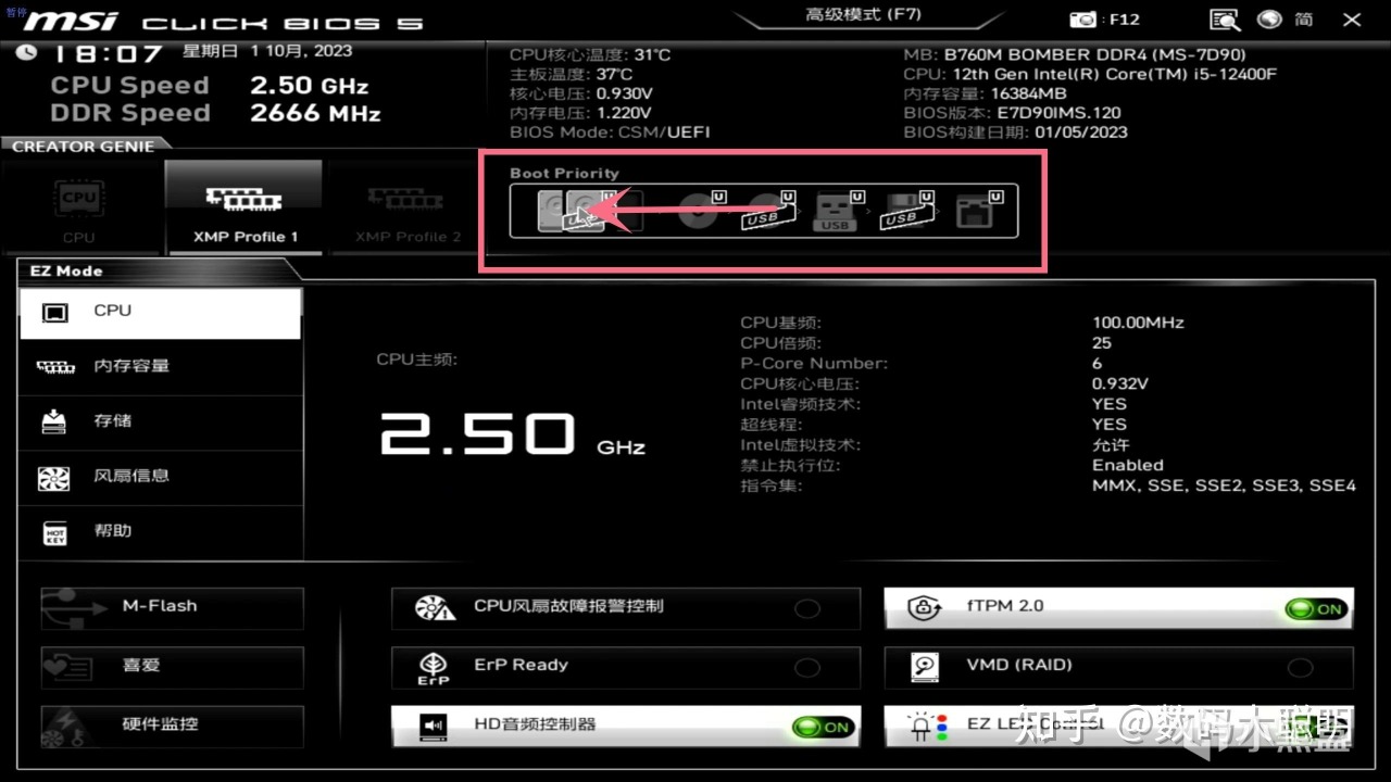 此時華碩的XMP已經打開,同樣的位置會顯示出內存默認的XM設置,在右側「啓動優先級」模塊處,會顯示系統檢測到的硬盤