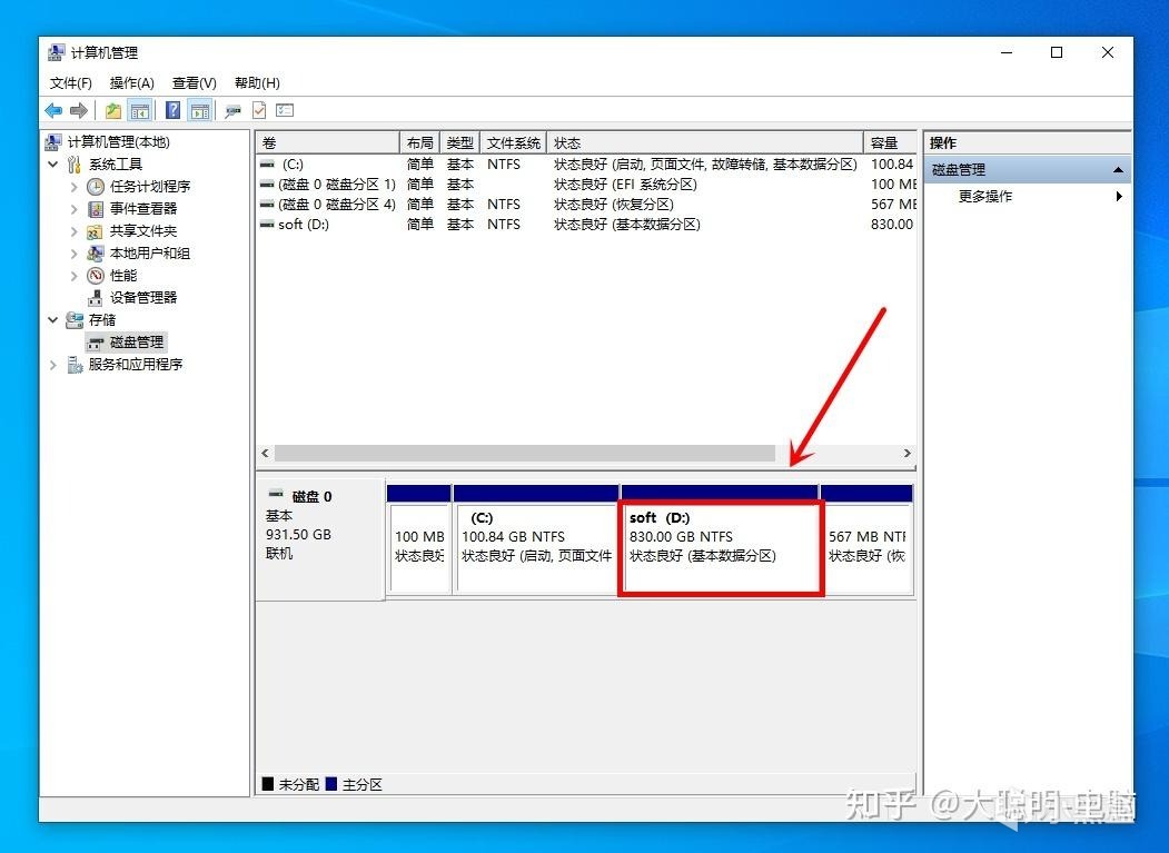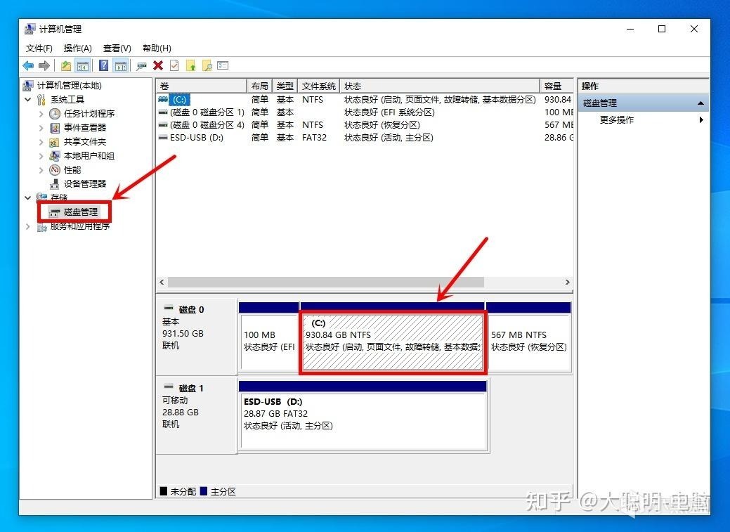 此時桌面彈出管理窗口,選擇左邊菜單中的「磁盤管理」如下圖顯示,該窗口中下部磁盤模塊顯示區域中,這是一塊剛做好系統的1T容量固態,C盤930GB,我們的目的就是將這930GB的區域分割出自己想要的大小;選中區域帶有斜紋