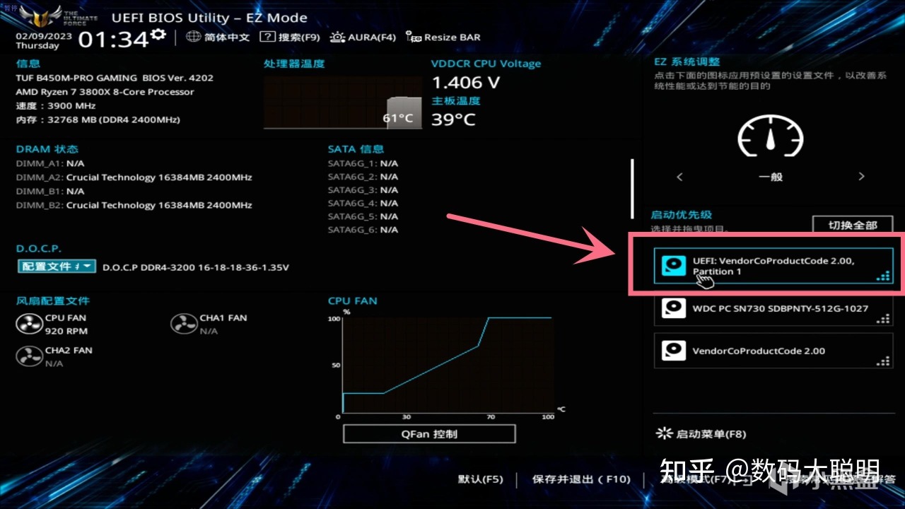 注意我的演示部分,在啓動順序下面有2個選項,一個是已經安裝好系統的系統盤,另一個「UEFI:VendorCoProductCode…」就是我們準備好的系統引導盤。正常的新主機沒有系統,上面的系統啓動盤是沒有的,在啓動順序這個地方只有UEFI啓動項,我們也不用設置。