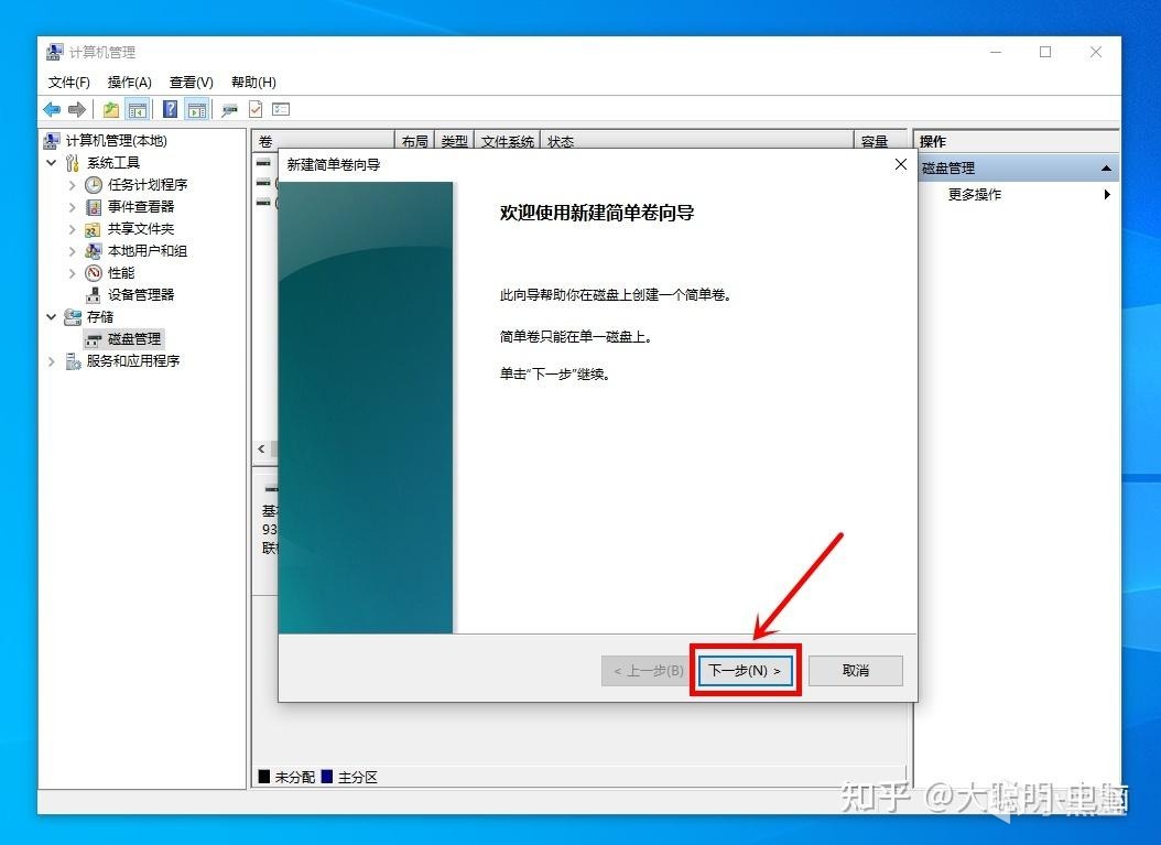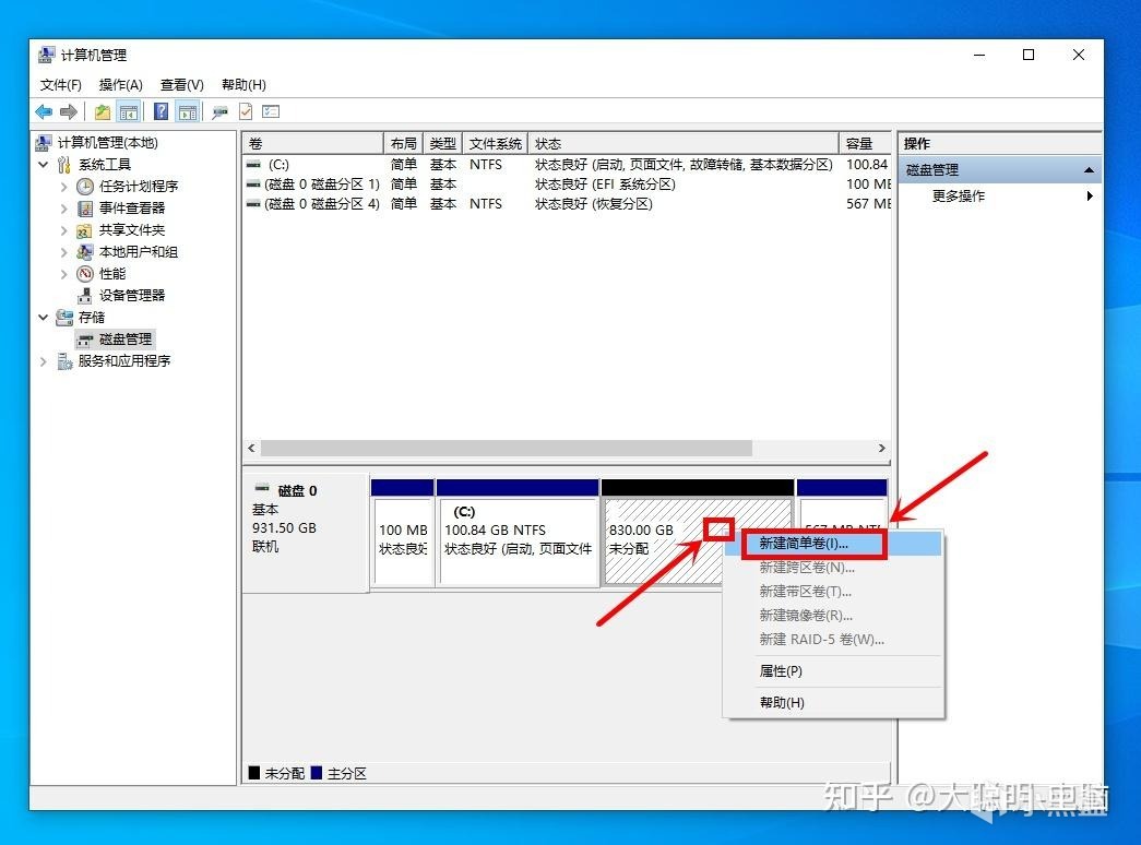 接着鼠標右鍵點擊我們分出來的空白盤,在彈出的菜單中選擇「新建簡單卷」