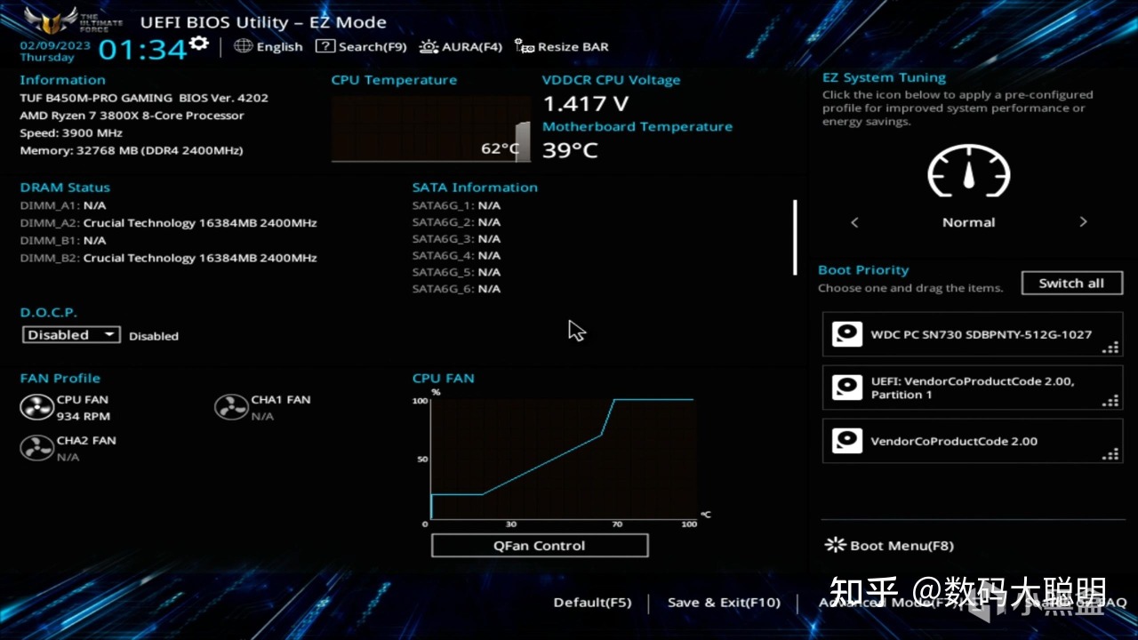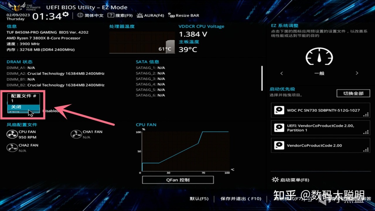 根據個人習慣,在左側D.O.C.P模塊處,點擊下方「關閉」的選項,會彈出來一個小菜單,選擇「配置文件1」,這裏是打開內存XMP