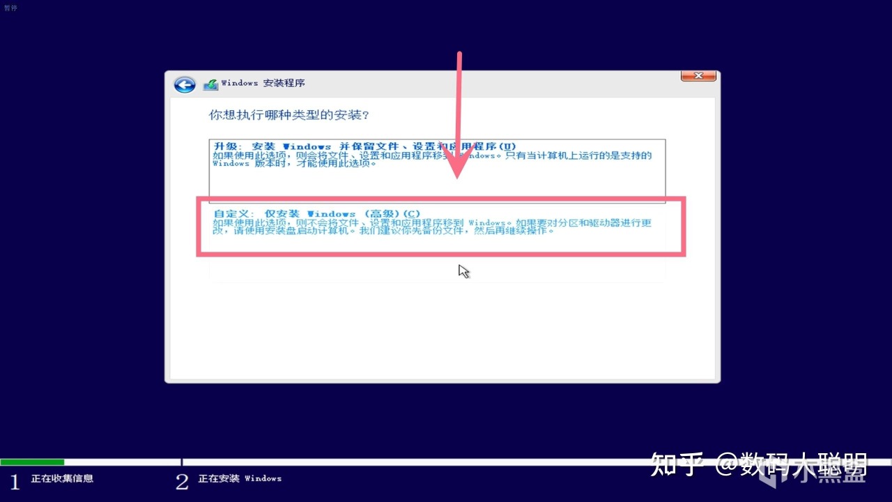 跳轉後有2個選項,第一個是升級以往的Windows系統,這個適用你的電腦有舊系統需要更新升級。我們新電腦直接點擊下面的「自定義:僅安裝Windows」,頁面自動跳轉